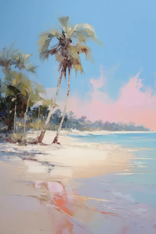 Poster Abstract tropisch strand met wit zand en palmbomen, blauwe lucht met witte wolken N° f46285