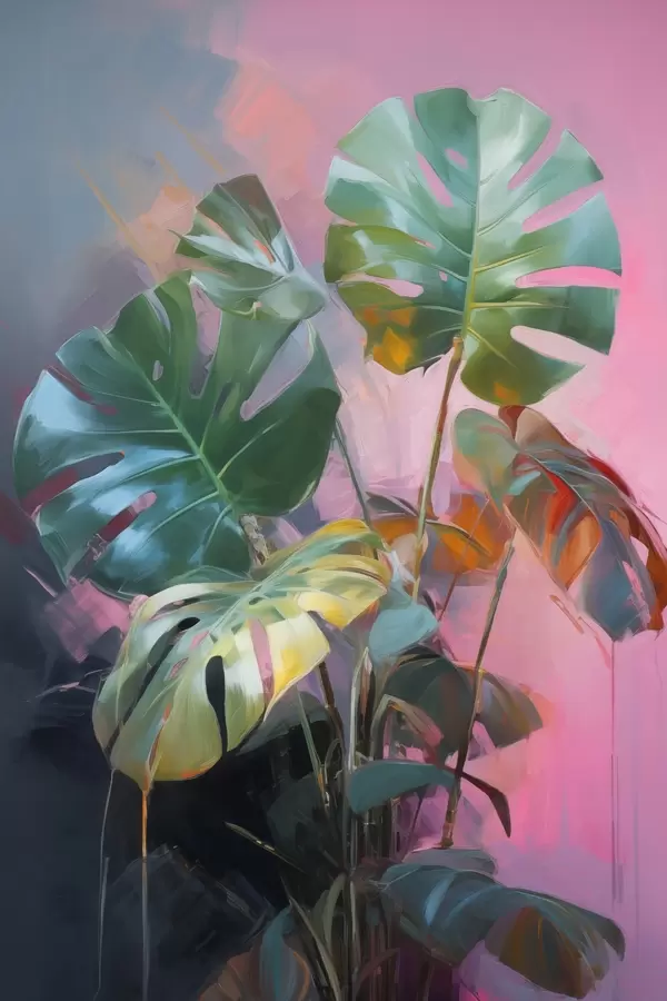 Poster Abstracte monstera-plant met levendig groene bladeren, tegen een achtergrond van zachte roze en paarse tinten N° f46286