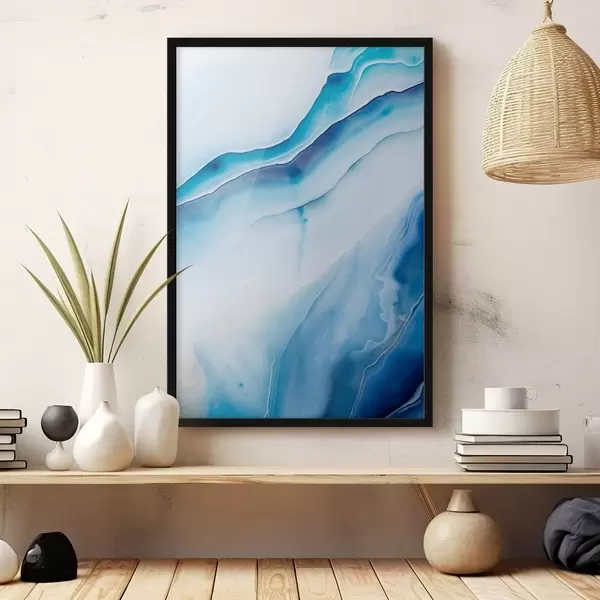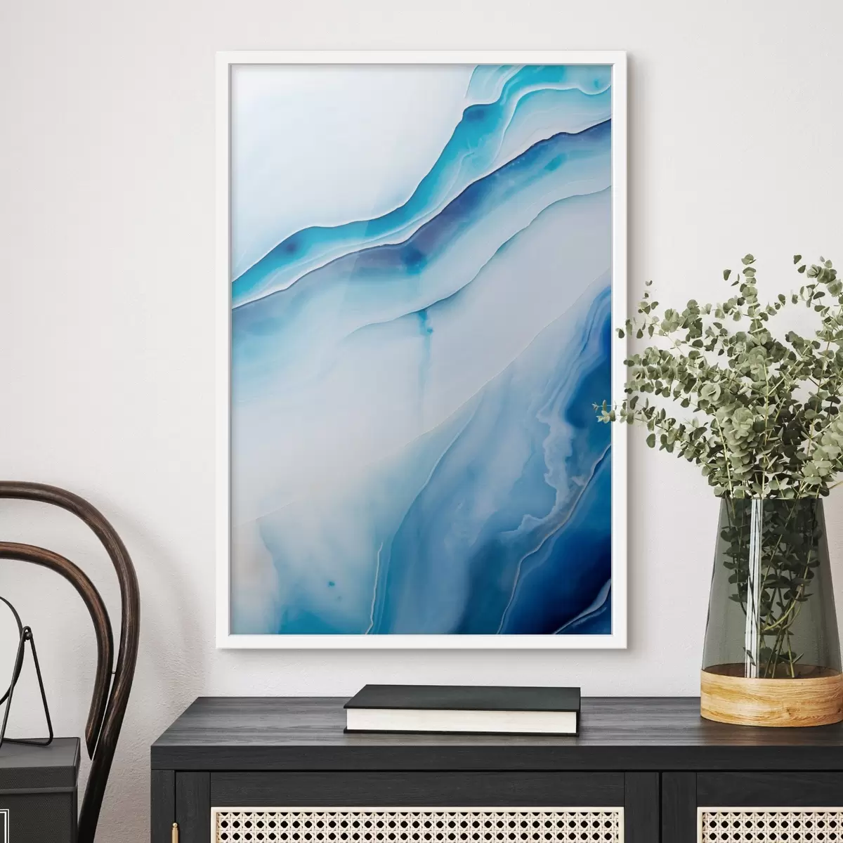 Poster Abstracte blauw-witte agaatprint, wervelende lijnen en kleurverlopen, gladde textuur, moderne kunst, minimalistisch N° f46291