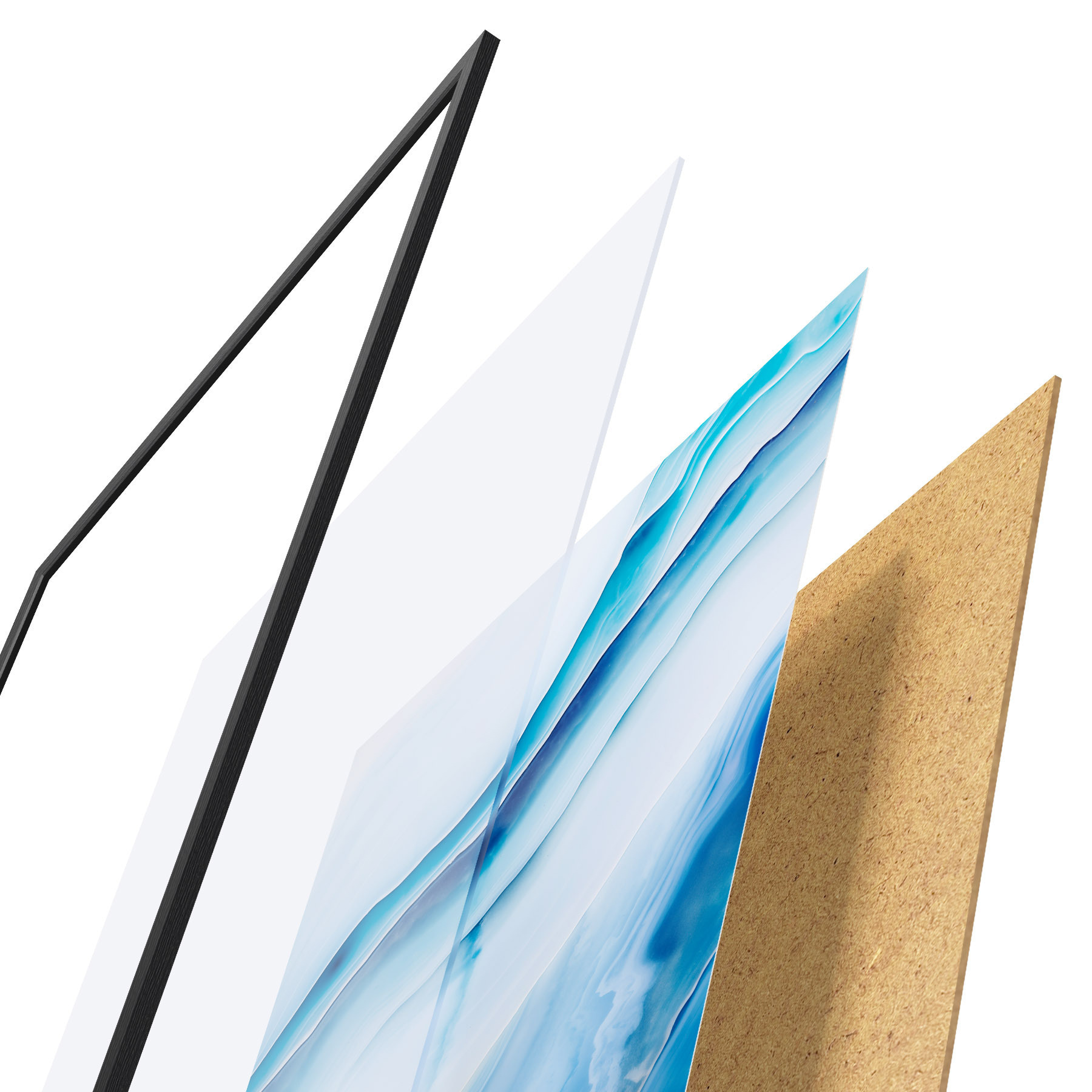 De poster bestaat uit een frame, plexiglas, geprinte afbeelding en spaanplaat achterkant. De poster kan meteen aan de muur worden gehangen dankzij de bevestigingen op de achterkant.