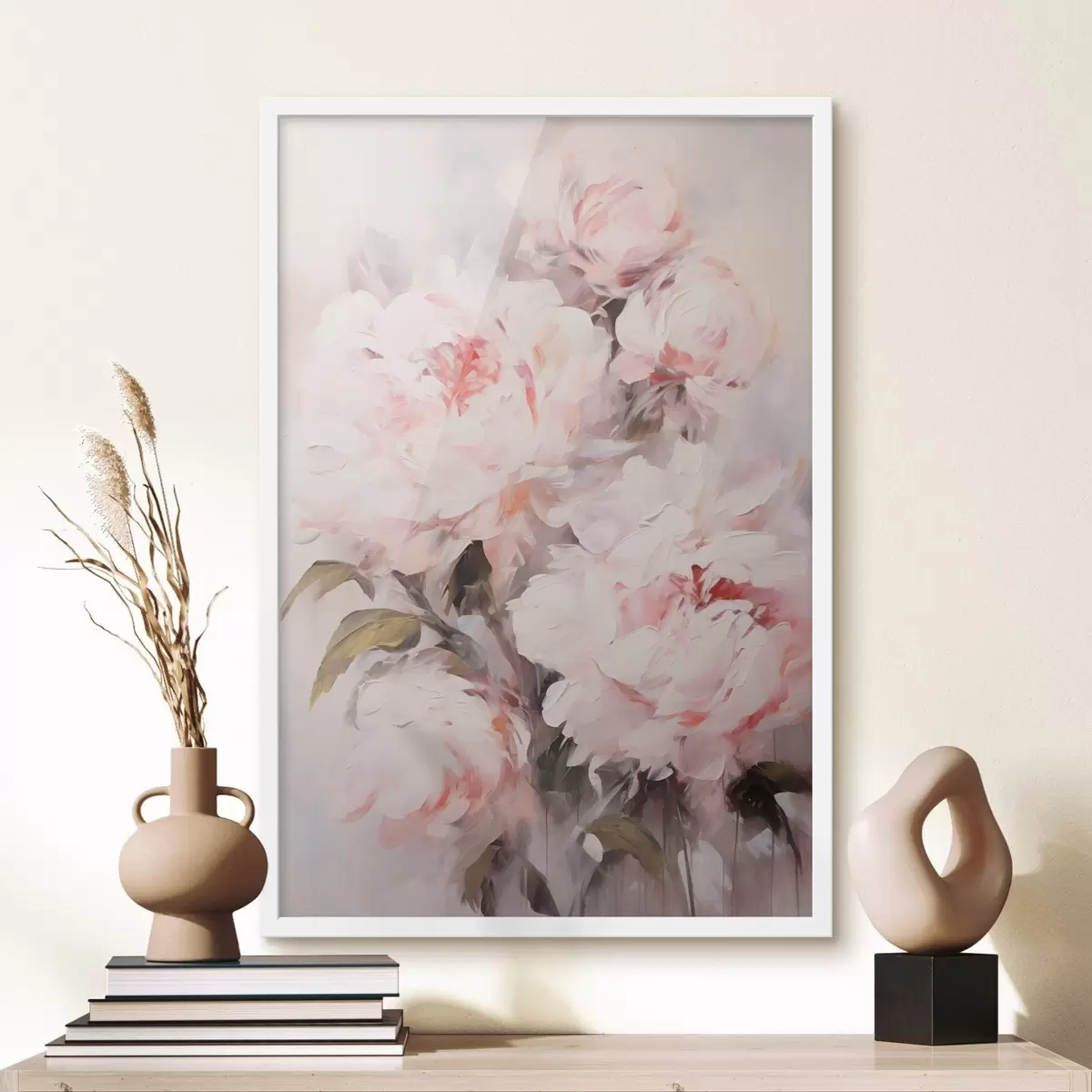Poster Een boeket lichtroze pioenrozen met groene bladeren, zachte penseelstreken, pastelkleuren, op een lichte achtergrond f46294