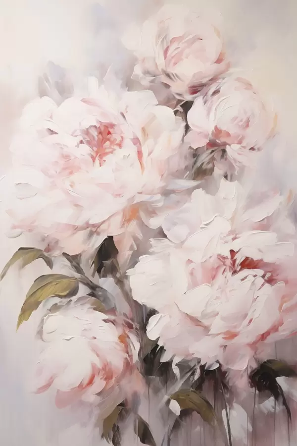 Poster Een boeket lichtroze pioenrozen met groene bladeren, zachte penseelstreken, pastelkleuren, op een lichte achtergrond f46294