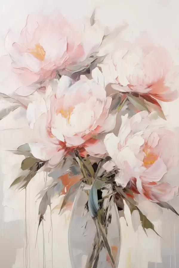 Poster Een boeket roze en witte pioenrozen in een glazen vaas, zachte penseelstreken, pastelkleuren, neutrale achtergrond N° f46295