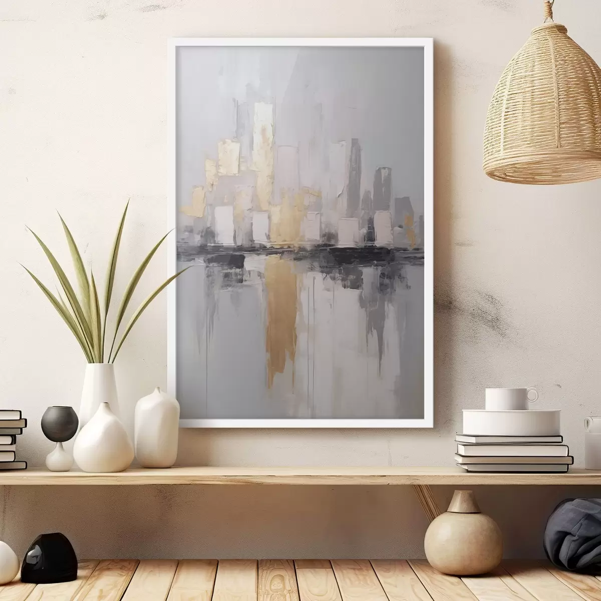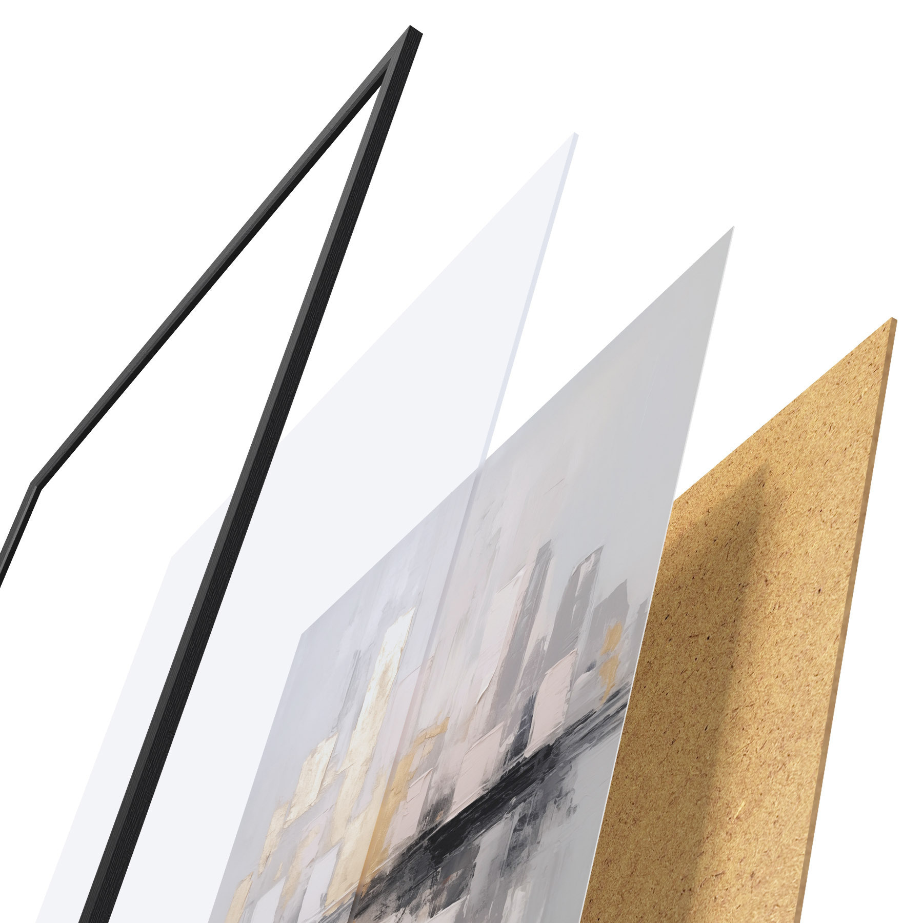 De poster bestaat uit een frame, plexiglas, geprinte afbeelding en spaanplaat achterkant. De poster kan meteen aan de muur worden gehangen dankzij de bevestigingen op de achterkant.