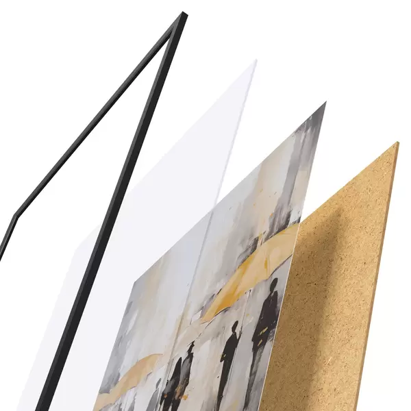 De poster bestaat uit een frame, plexiglas, geprinte afbeelding en spaanplaat achterkant. De poster kan meteen aan de muur worden gehangen dankzij de bevestigingen op de achterkant.