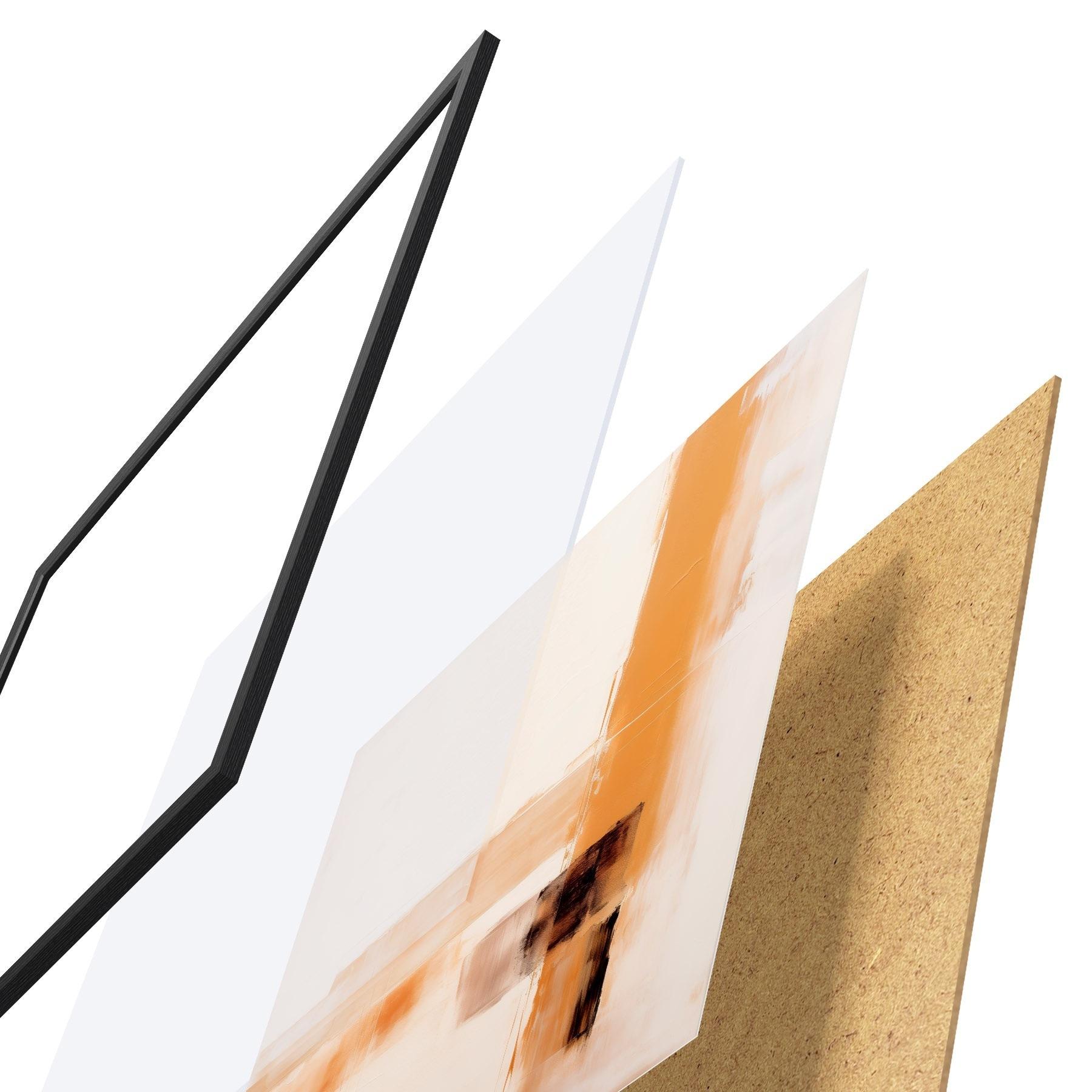 De poster bestaat uit een frame, plexiglas, geprinte afbeelding en spaanplaat achterkant. De poster kan meteen aan de muur worden gehangen dankzij de bevestigingen op de achterkant.