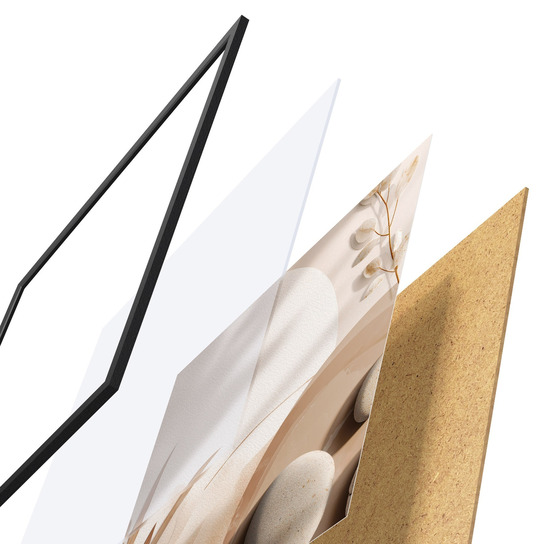 De poster bestaat uit een frame, plexiglas, geprinte afbeelding en spaanplaat achterkant. De poster kan meteen aan de muur worden gehangen dankzij de bevestigingen op de achterkant.