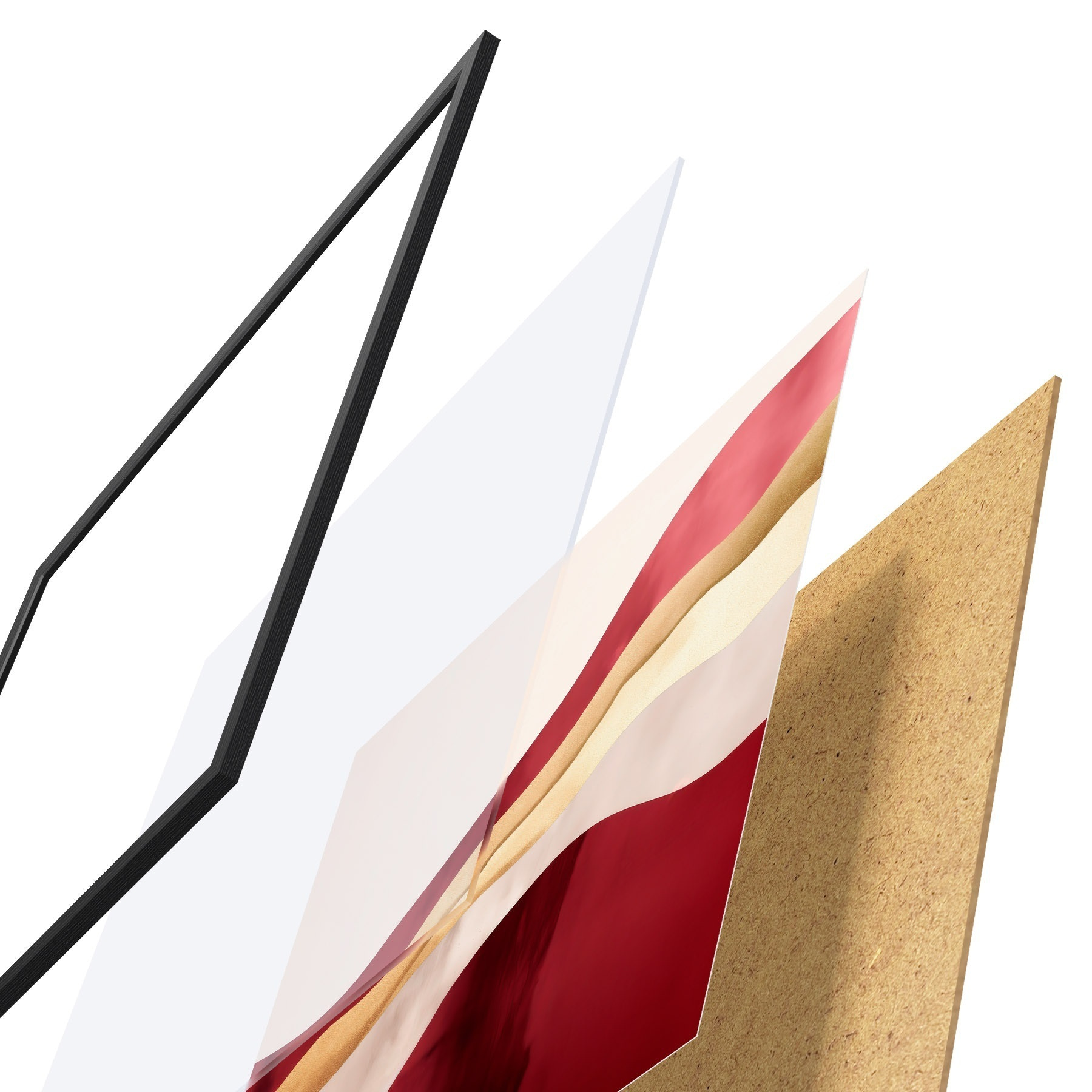 De poster bestaat uit een frame, plexiglas, geprinte afbeelding en spaanplaat achterkant. De poster kan meteen aan de muur worden gehangen dankzij de bevestigingen op de achterkant.