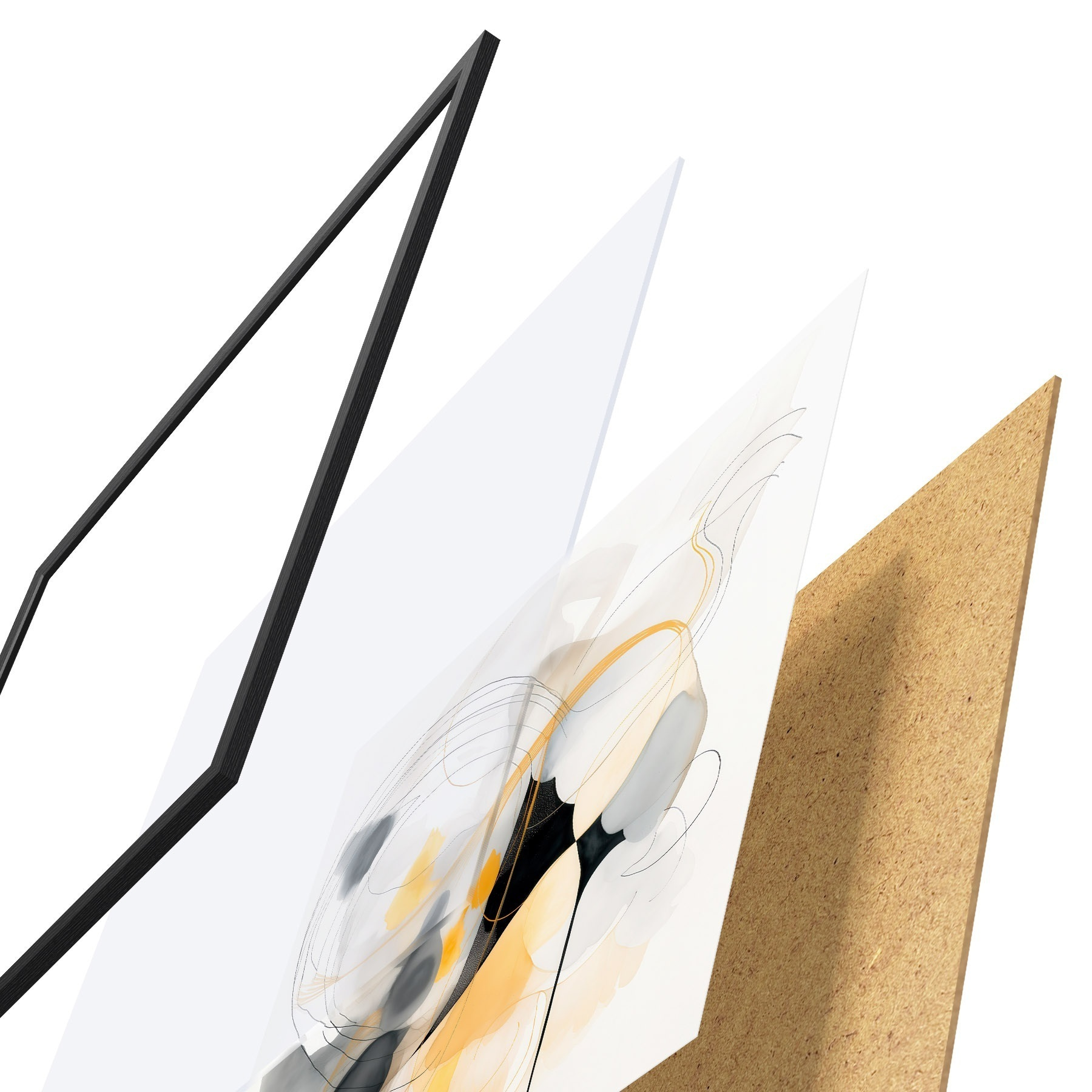 De poster bestaat uit een frame, plexiglas, geprinte afbeelding en spaanplaat achterkant. De poster kan meteen aan de muur worden gehangen dankzij de bevestigingen op de achterkant.
