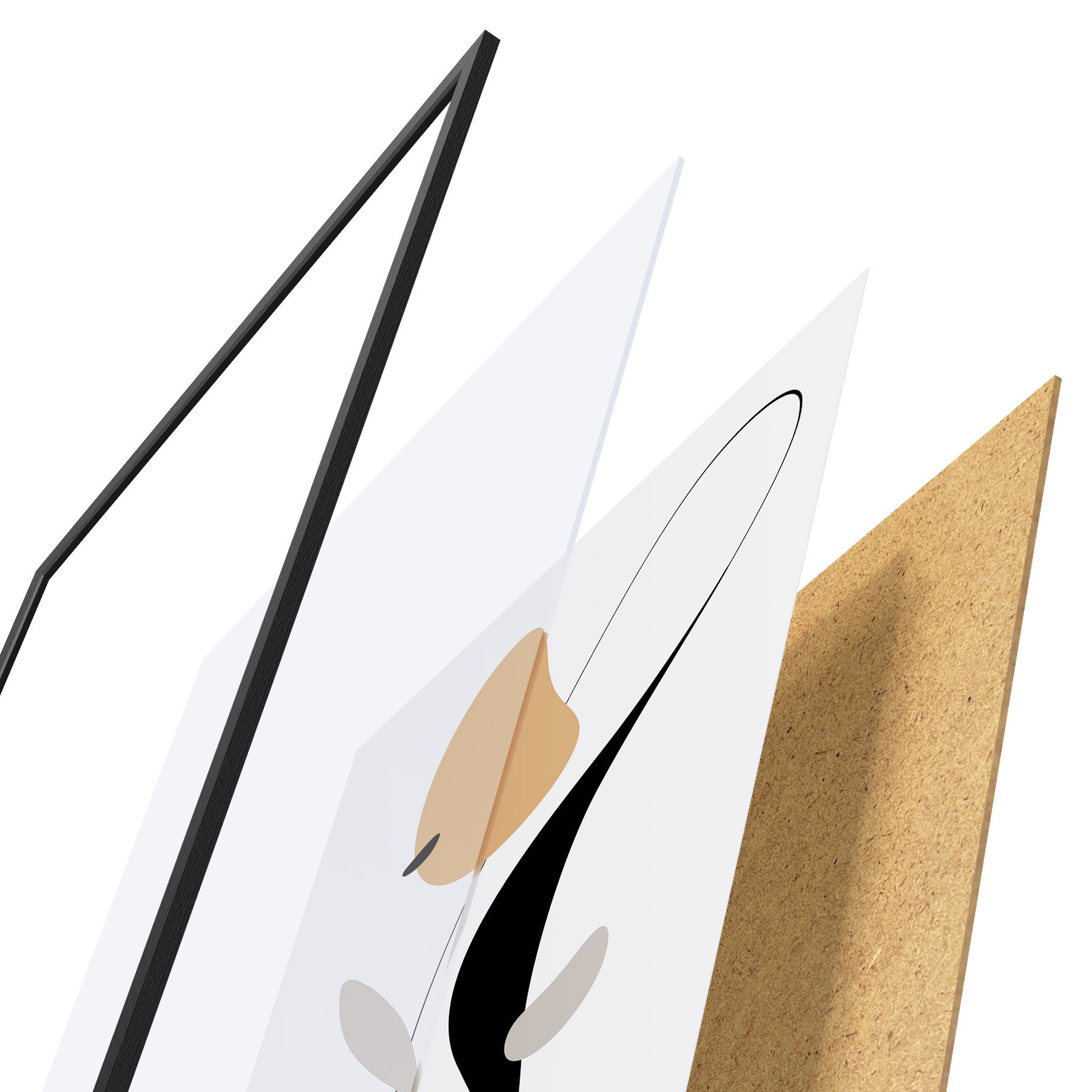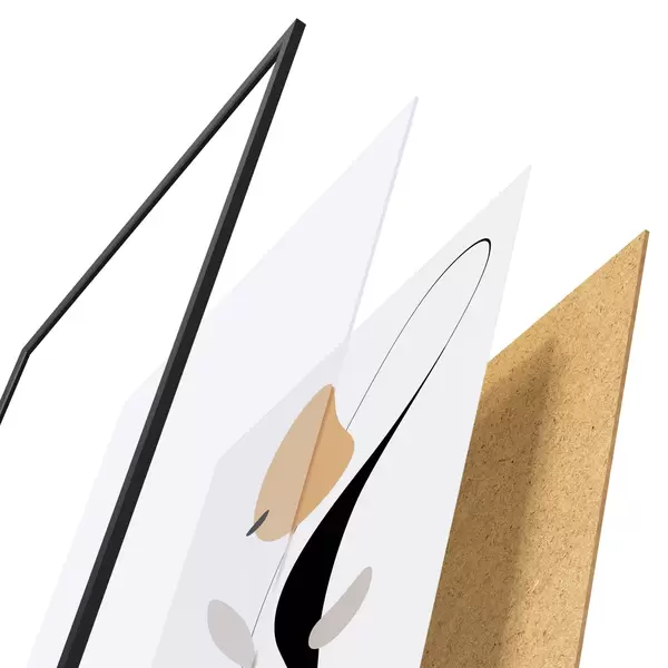 De poster bestaat uit een frame, plexiglas, geprinte afbeelding en spaanplaat achterkant. De poster kan meteen aan de muur worden gehangen dankzij de bevestigingen op de achterkant.