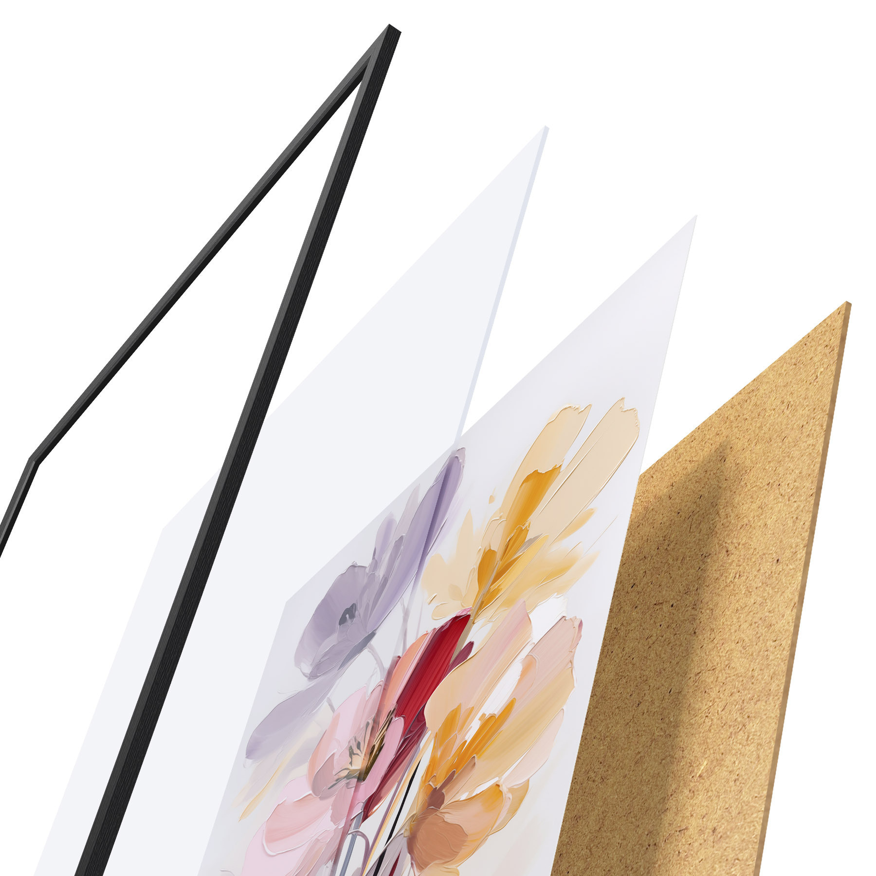 De poster bestaat uit een frame, plexiglas, geprinte afbeelding en spaanplaat achterkant. De poster kan meteen aan de muur worden gehangen dankzij de bevestigingen op de achterkant.