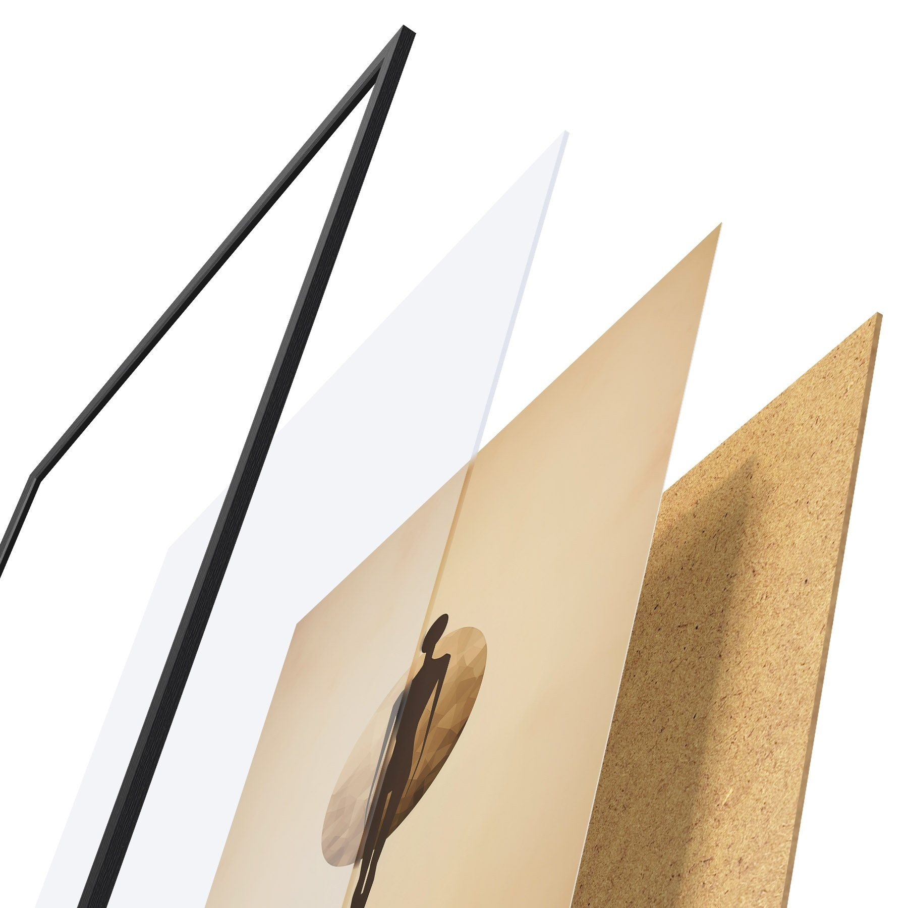 De poster bestaat uit een frame, plexiglas, geprinte afbeelding en spaanplaat achterkant. De poster kan meteen aan de muur worden gehangen dankzij de bevestigingen op de achterkant.