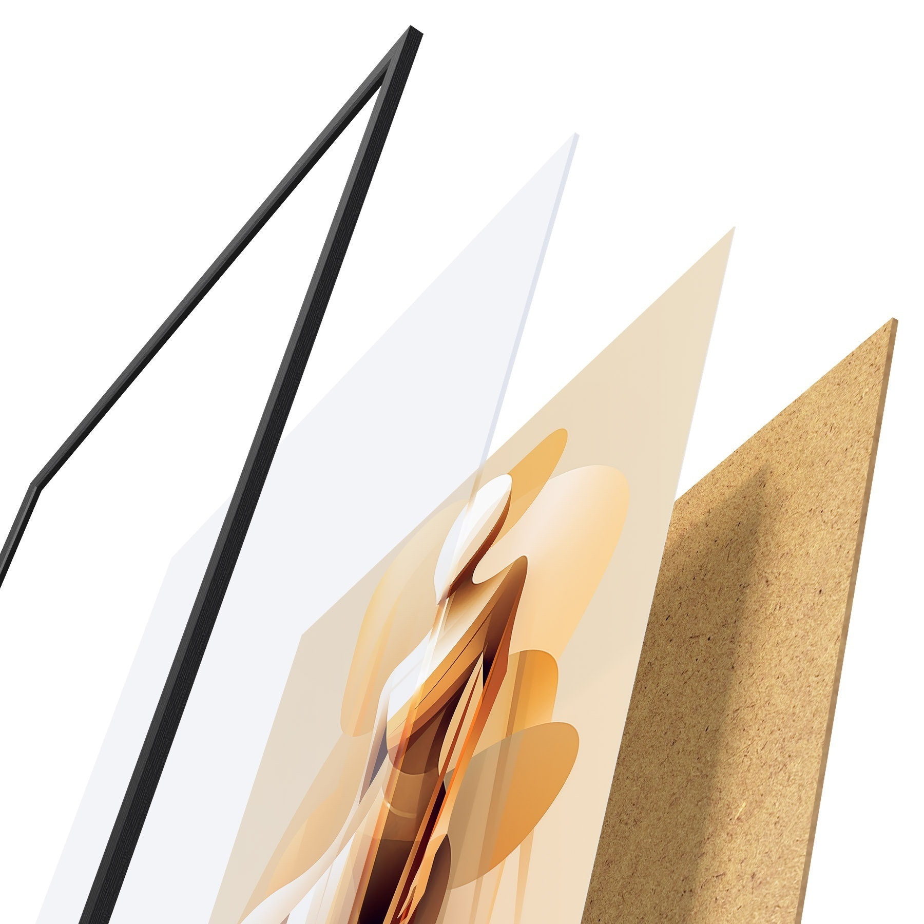 De poster bestaat uit een frame, plexiglas, geprinte afbeelding en spaanplaat achterkant. De poster kan meteen aan de muur worden gehangen dankzij de bevestigingen op de achterkant.
