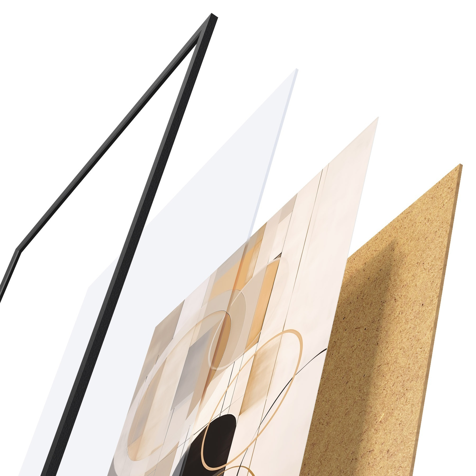 De poster bestaat uit een frame, plexiglas, geprinte afbeelding en spaanplaat achterkant. De poster kan meteen aan de muur worden gehangen dankzij de bevestigingen op de achterkant.