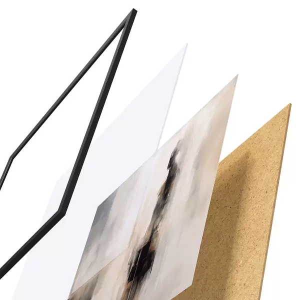 De poster bestaat uit een frame, plexiglas, geprinte afbeelding en spaanplaat achterkant. De poster kan meteen aan de muur worden gehangen dankzij de bevestigingen op de achterkant.