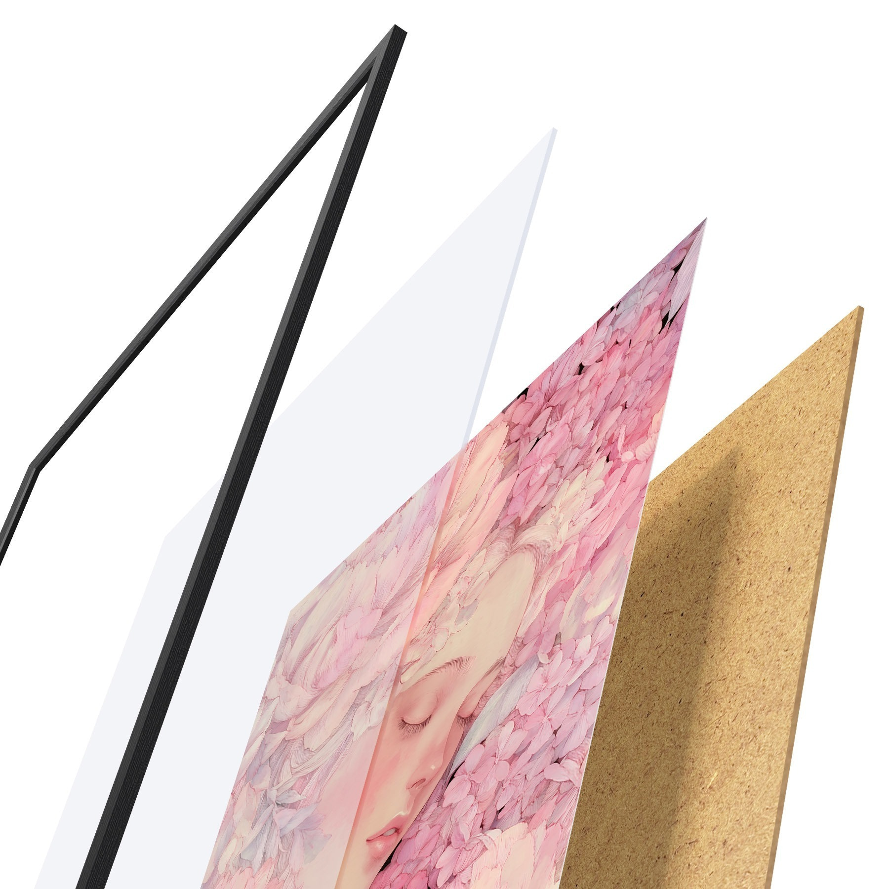 De poster bestaat uit een frame, plexiglas, geprinte afbeelding en spaanplaat achterkant. De poster kan meteen aan de muur worden gehangen dankzij de bevestigingen op de achterkant.