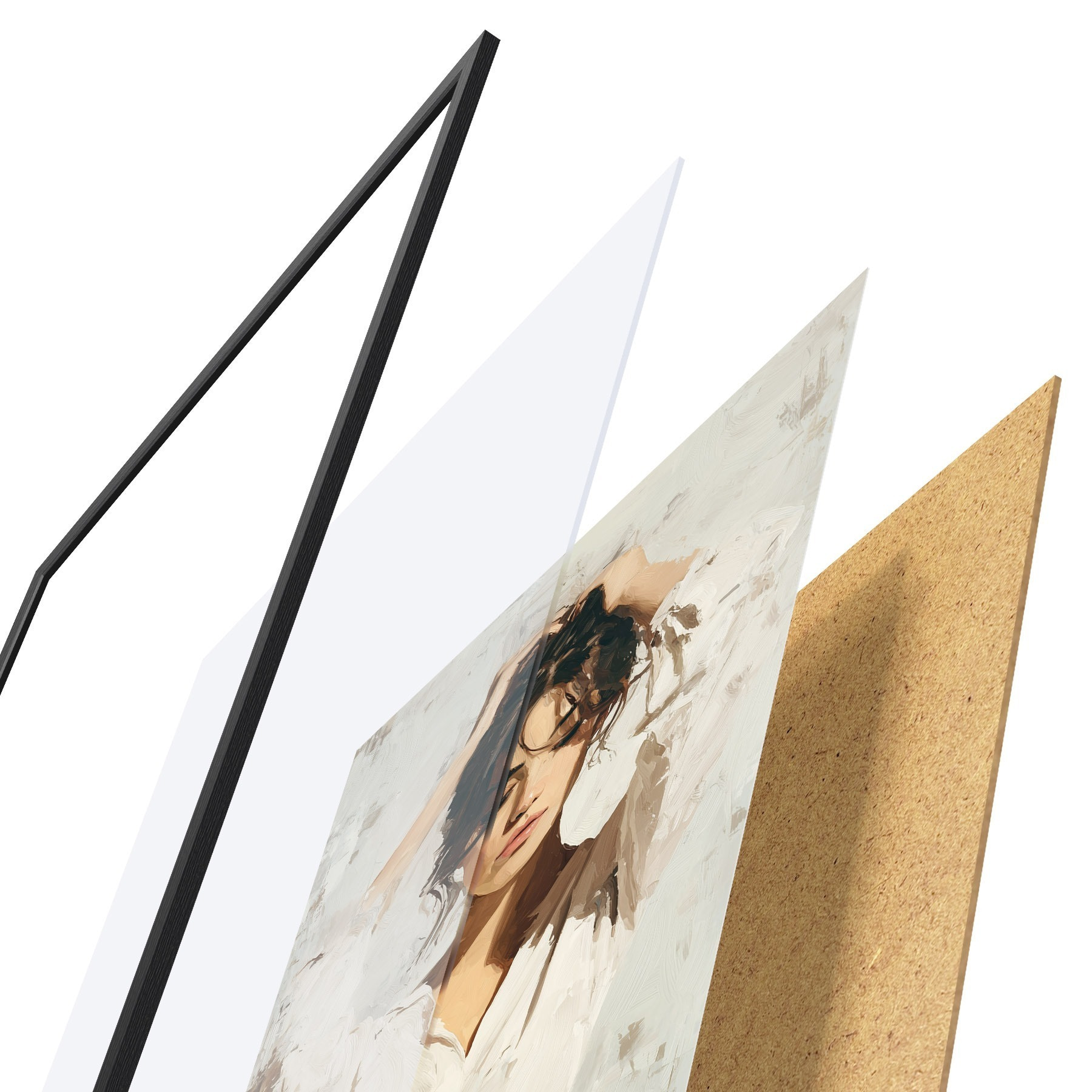 De poster bestaat uit een frame, plexiglas, geprinte afbeelding en spaanplaat achterkant. De poster kan meteen aan de muur worden gehangen dankzij de bevestigingen op de achterkant.