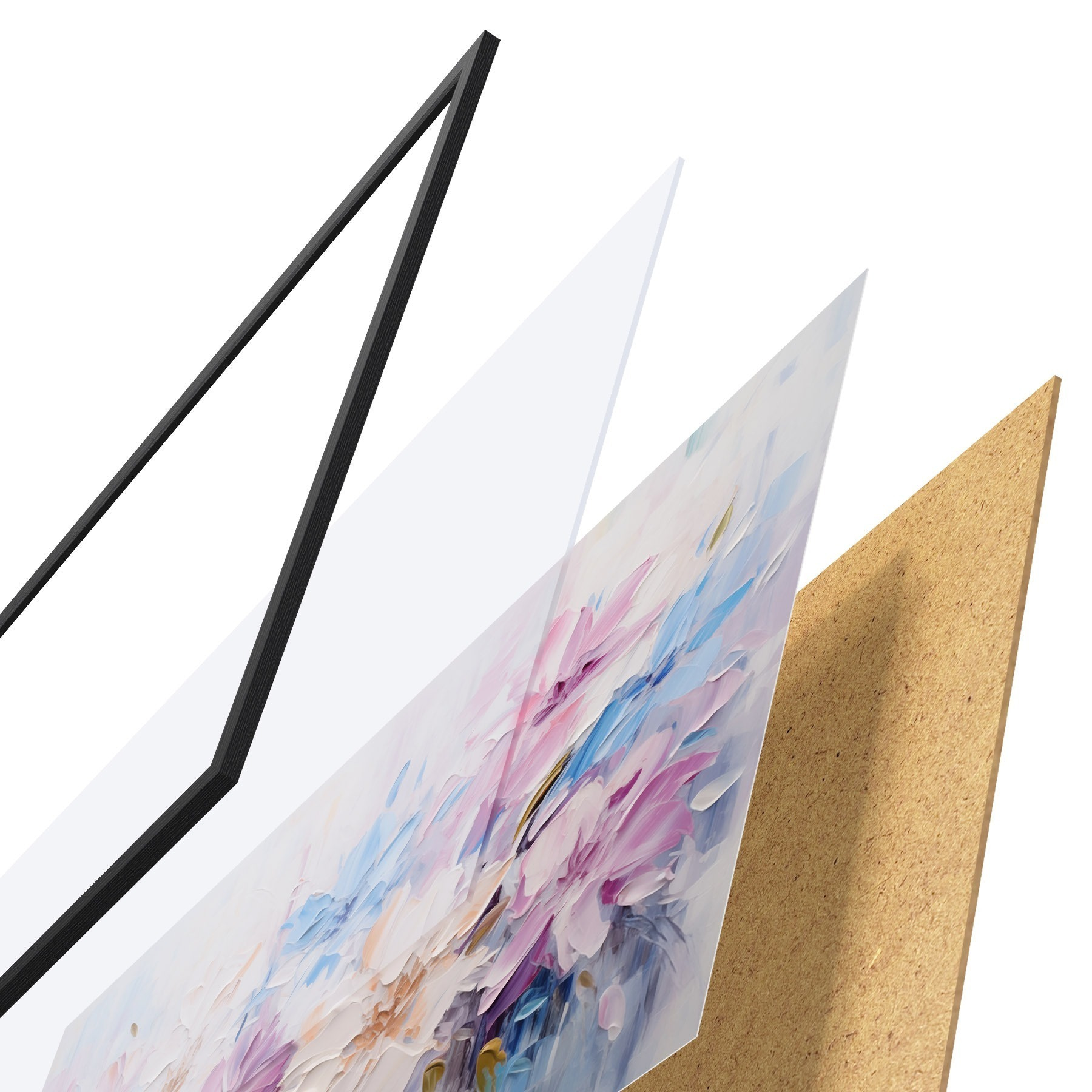 De poster bestaat uit een frame, plexiglas, geprinte afbeelding en spaanplaat achterkant. De poster kan meteen aan de muur worden gehangen dankzij de bevestigingen op de achterkant.