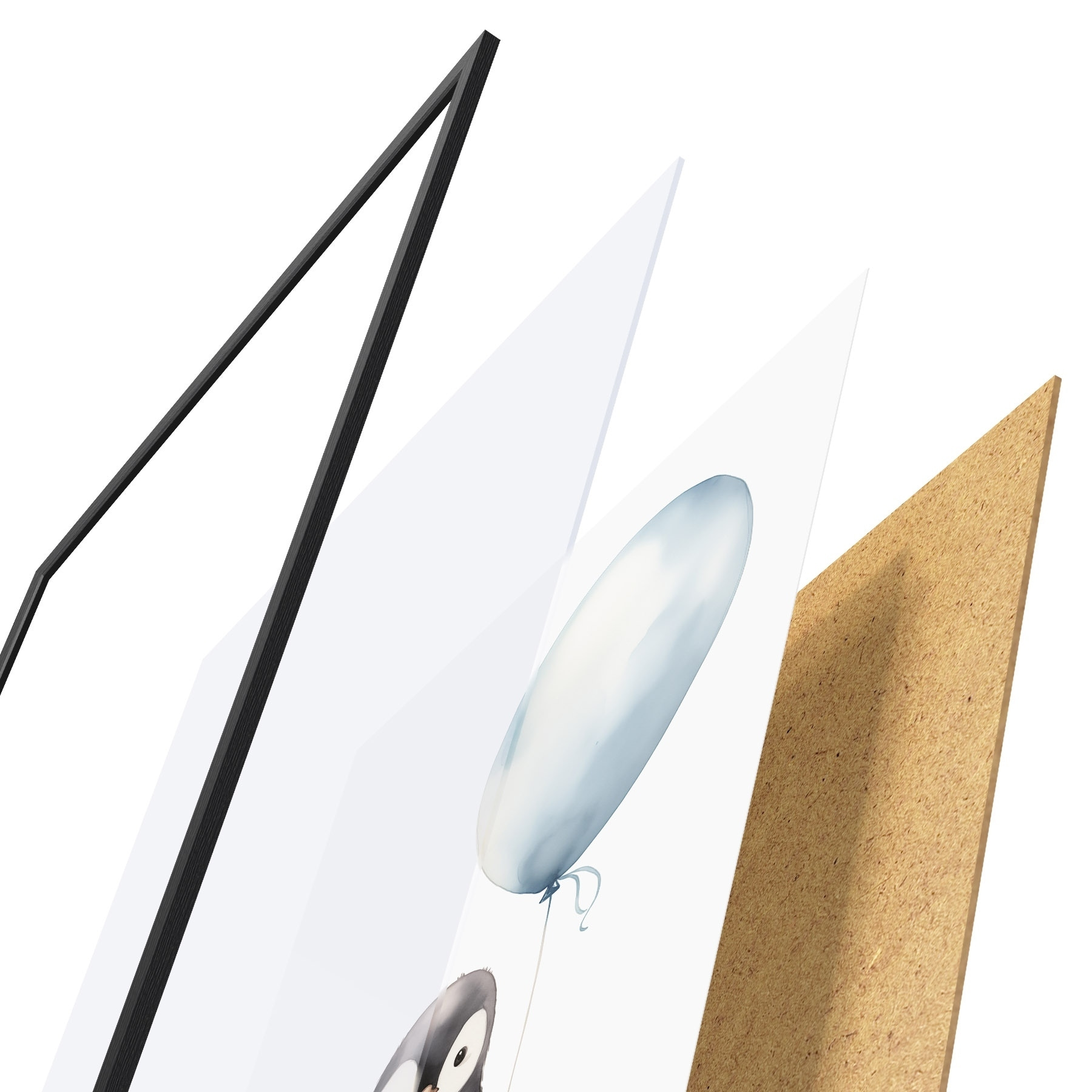 De poster bestaat uit een frame, plexiglas, geprinte afbeelding en spaanplaat achterkant. De poster kan meteen aan de muur worden gehangen dankzij de bevestigingen op de achterkant.