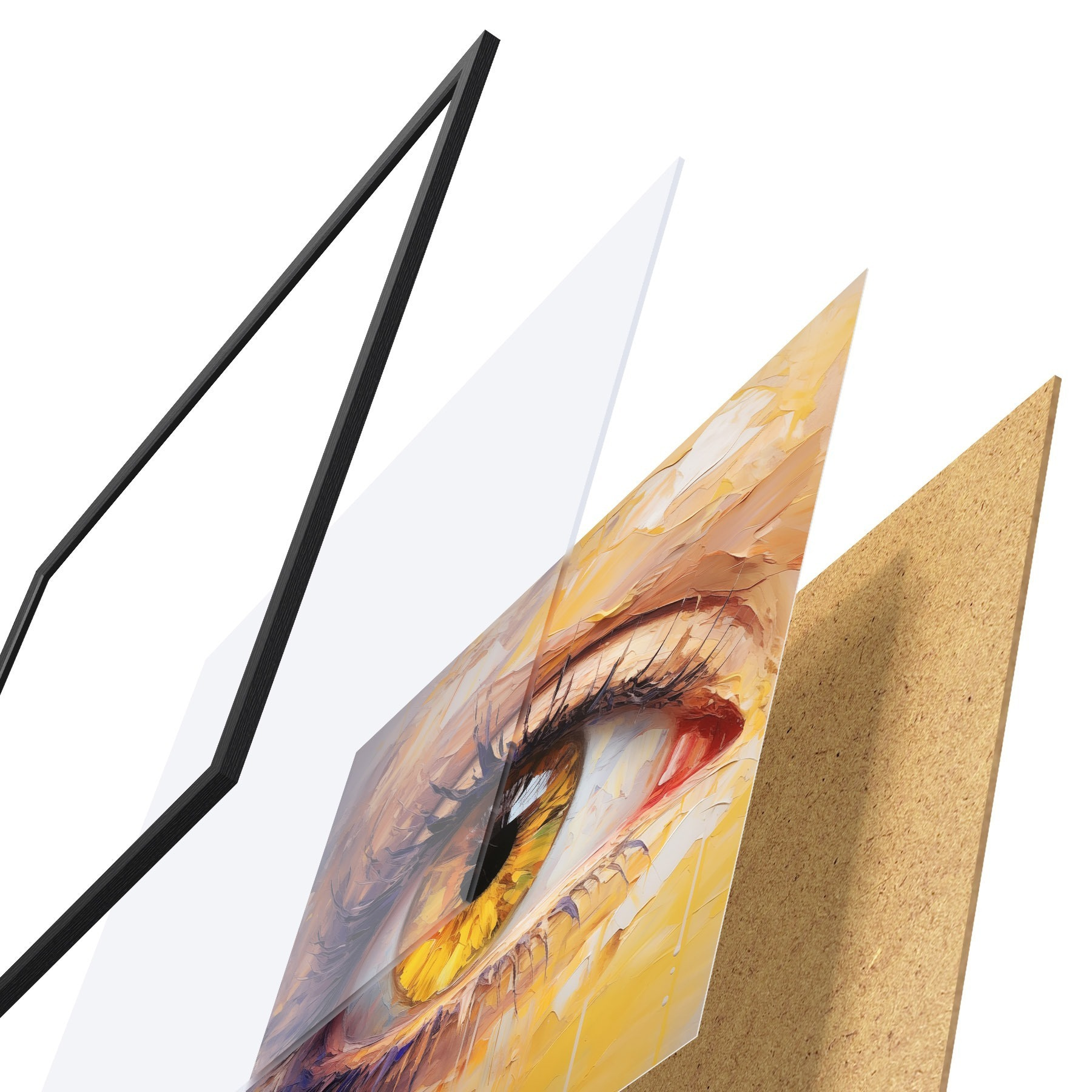 De poster bestaat uit een frame, plexiglas, geprinte afbeelding en spaanplaat achterkant. De poster kan meteen aan de muur worden gehangen dankzij de bevestigingen op de achterkant.