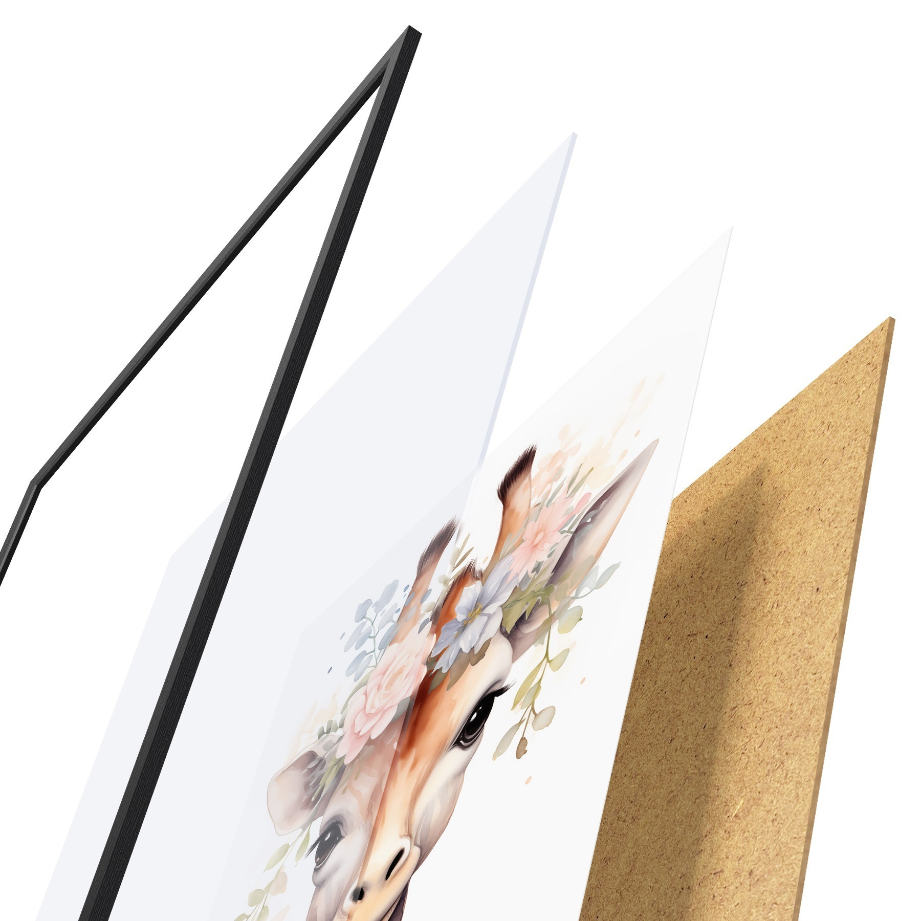 De poster bestaat uit een frame, plexiglas, geprinte afbeelding en spaanplaat achterkant. De poster kan meteen aan de muur worden gehangen dankzij de bevestigingen op de achterkant.