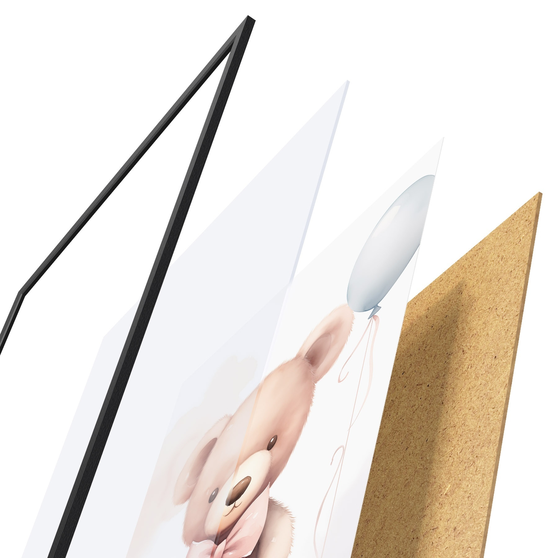 De poster bestaat uit een frame, plexiglas, geprinte afbeelding en spaanplaat achterkant. De poster kan meteen aan de muur worden gehangen dankzij de bevestigingen op de achterkant.