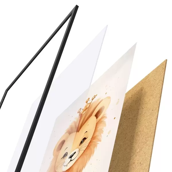 De poster bestaat uit een frame, plexiglas, geprinte afbeelding en spaanplaat achterkant. De poster kan meteen aan de muur worden gehangen dankzij de bevestigingen op de achterkant.