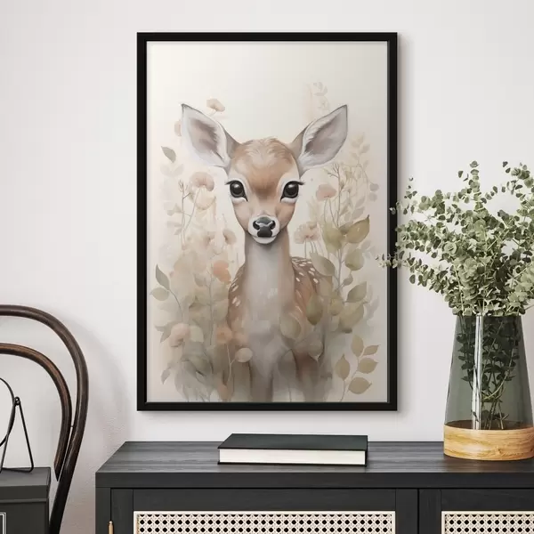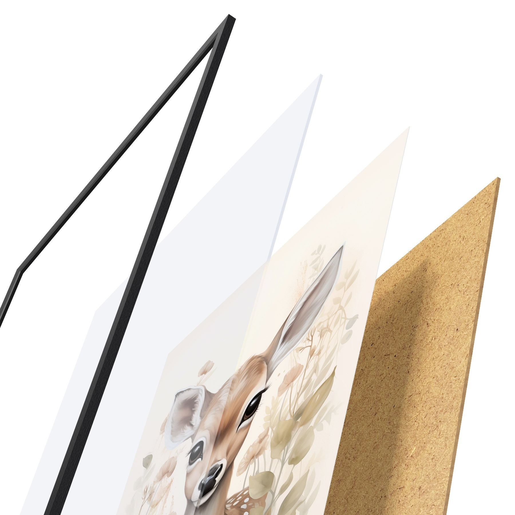 De poster bestaat uit een frame, plexiglas, geprinte afbeelding en spaanplaat achterkant. De poster kan meteen aan de muur worden gehangen dankzij de bevestigingen op de achterkant.