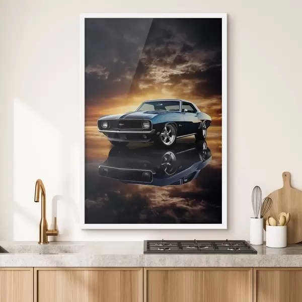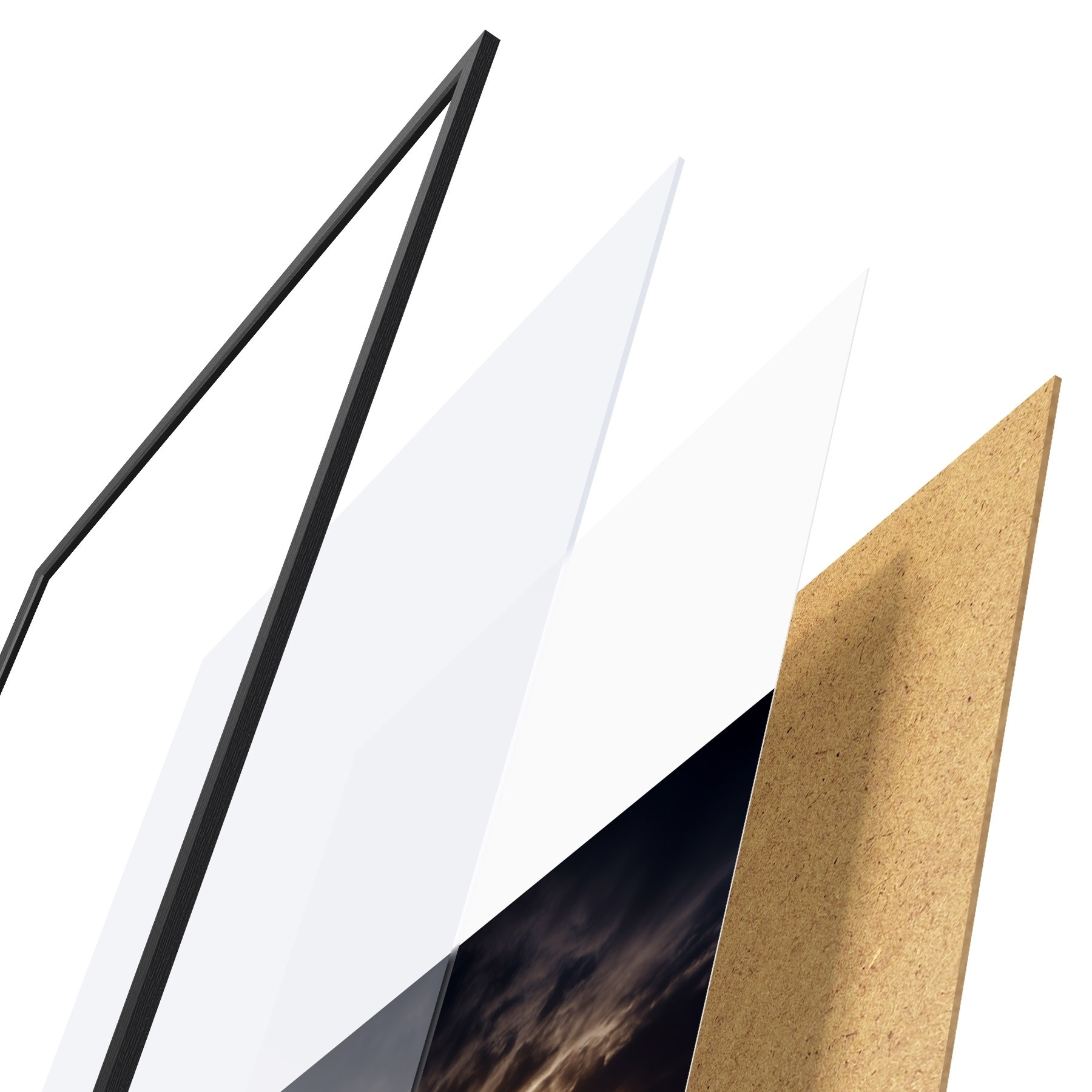 De poster bestaat uit een frame, plexiglas, geprinte afbeelding en spaanplaat achterkant. De poster kan meteen aan de muur worden gehangen dankzij de bevestigingen op de achterkant.