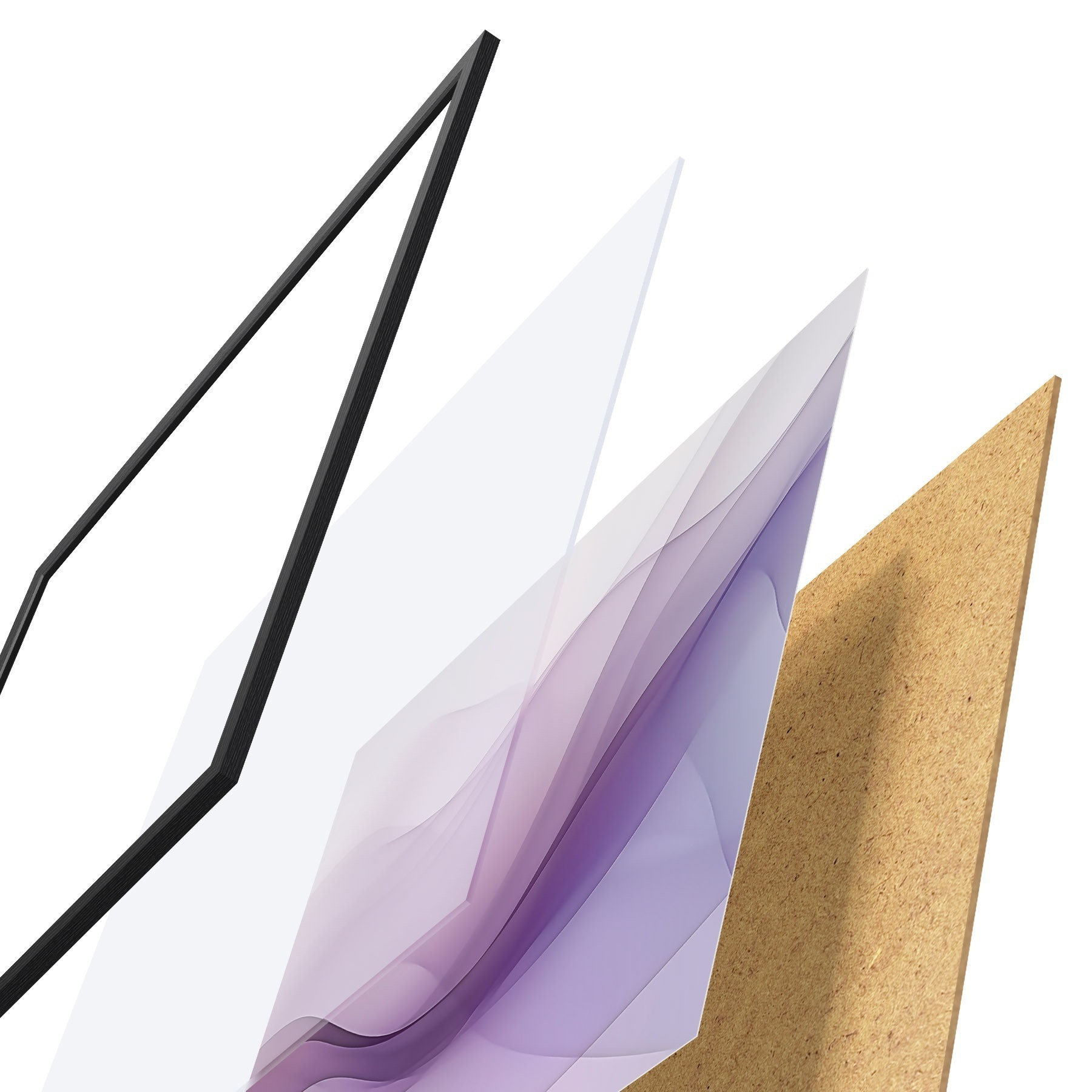 De poster bestaat uit een frame, plexiglas, geprinte afbeelding en spaanplaat achterkant. De poster kan meteen aan de muur worden gehangen dankzij de bevestigingen op de achterkant.