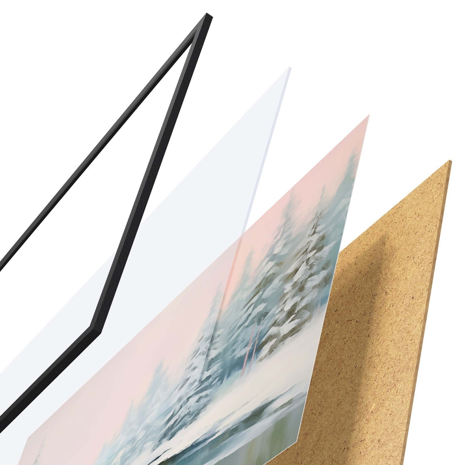 De poster bestaat uit een frame, plexiglas, geprinte afbeelding en spaanplaat achterkant. De poster kan meteen aan de muur worden gehangen dankzij de bevestigingen op de achterkant.