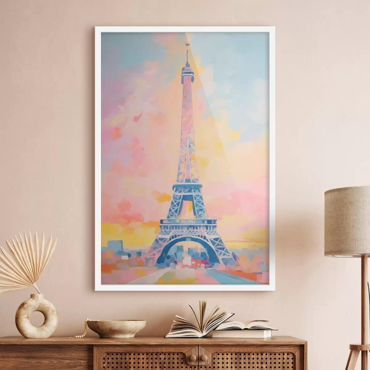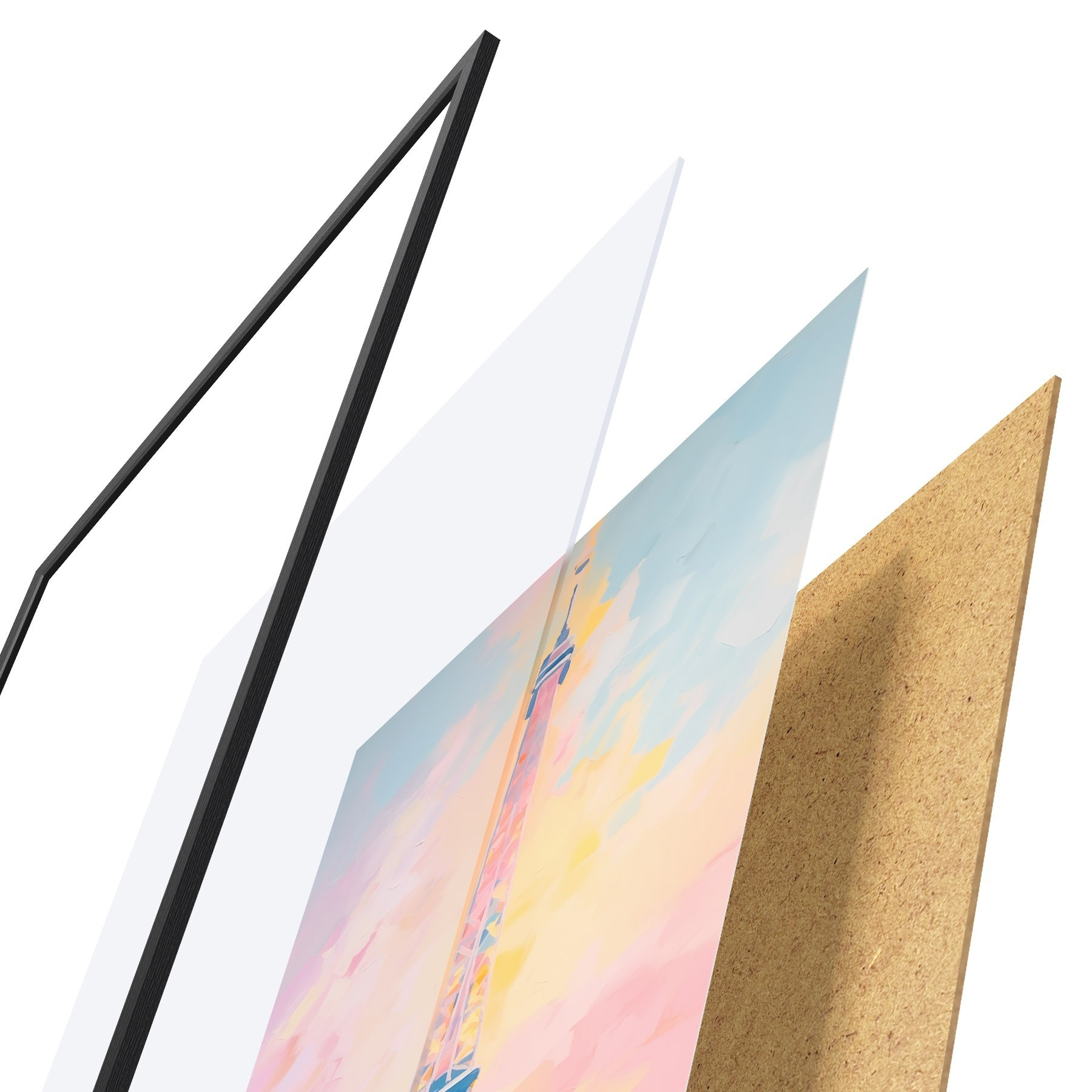 De poster bestaat uit een frame, plexiglas, geprinte afbeelding en spaanplaat achterkant. De poster kan meteen aan de muur worden gehangen dankzij de bevestigingen op de achterkant.