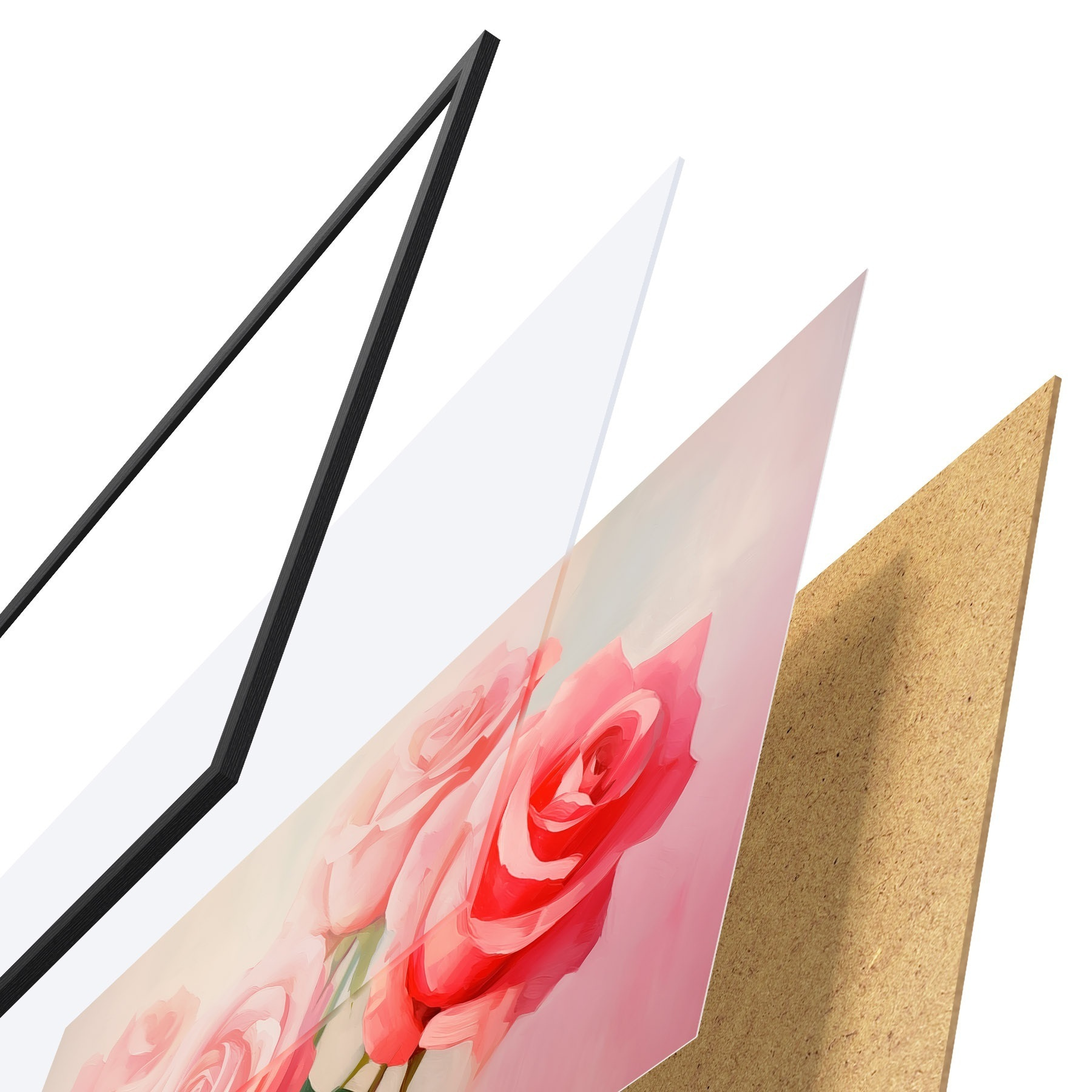 De poster bestaat uit een frame, plexiglas, geprinte afbeelding en spaanplaat achterkant. De poster kan meteen aan de muur worden gehangen dankzij de bevestigingen op de achterkant.