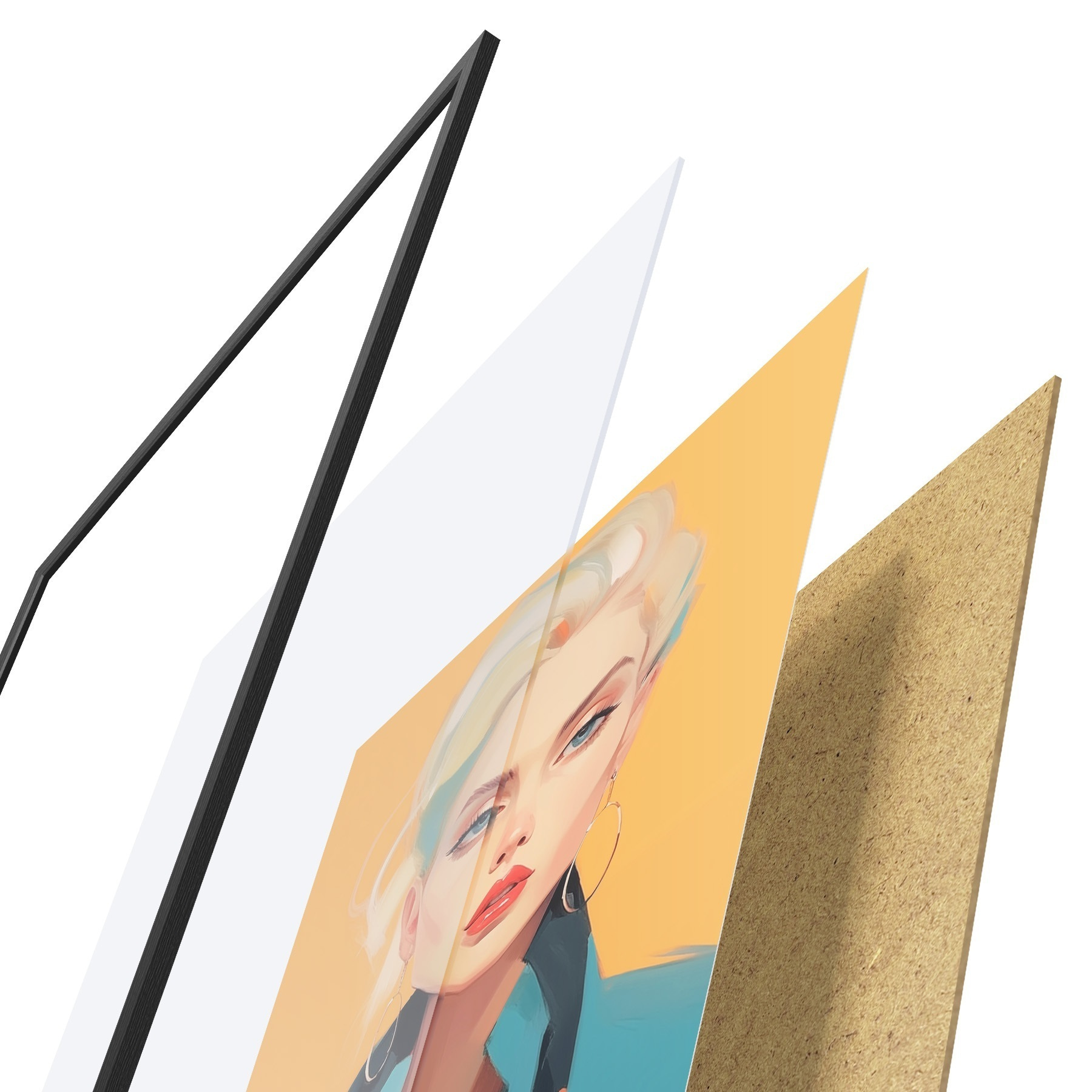 De poster bestaat uit een frame, plexiglas, geprinte afbeelding en spaanplaat achterkant. De poster kan meteen aan de muur worden gehangen dankzij de bevestigingen op de achterkant.