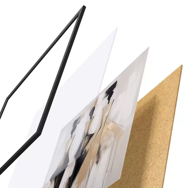 De poster bestaat uit een frame, plexiglas, geprinte afbeelding en spaanplaat achterkant. De poster kan meteen aan de muur worden gehangen dankzij de bevestigingen op de achterkant.