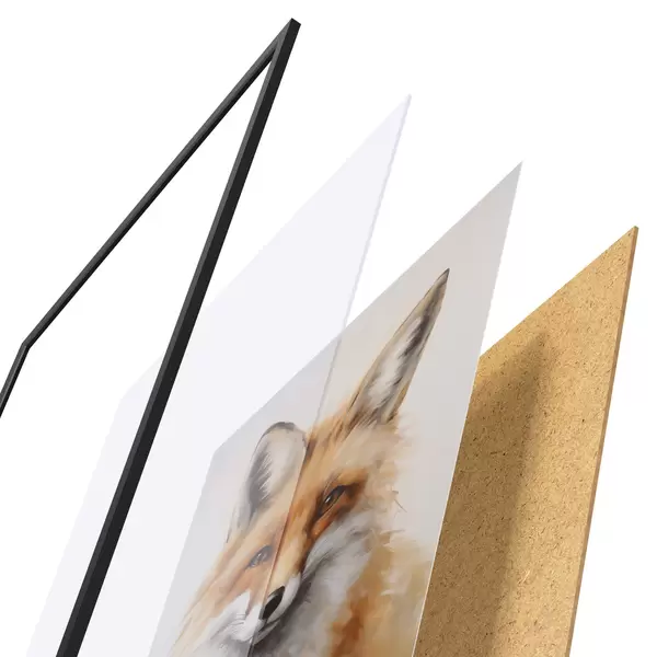 De poster bestaat uit een frame, plexiglas, geprinte afbeelding en spaanplaat achterkant. De poster kan meteen aan de muur worden gehangen dankzij de bevestigingen op de achterkant.
