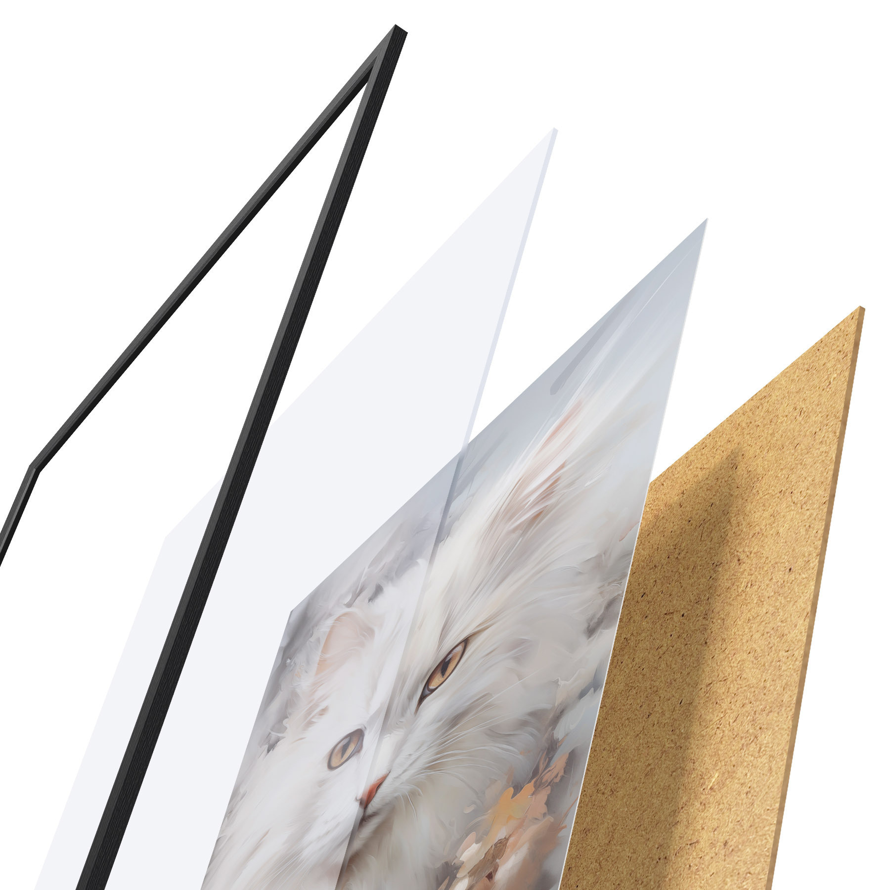 De poster bestaat uit een frame, plexiglas, geprinte afbeelding en spaanplaat achterkant. De poster kan meteen aan de muur worden gehangen dankzij de bevestigingen op de achterkant.