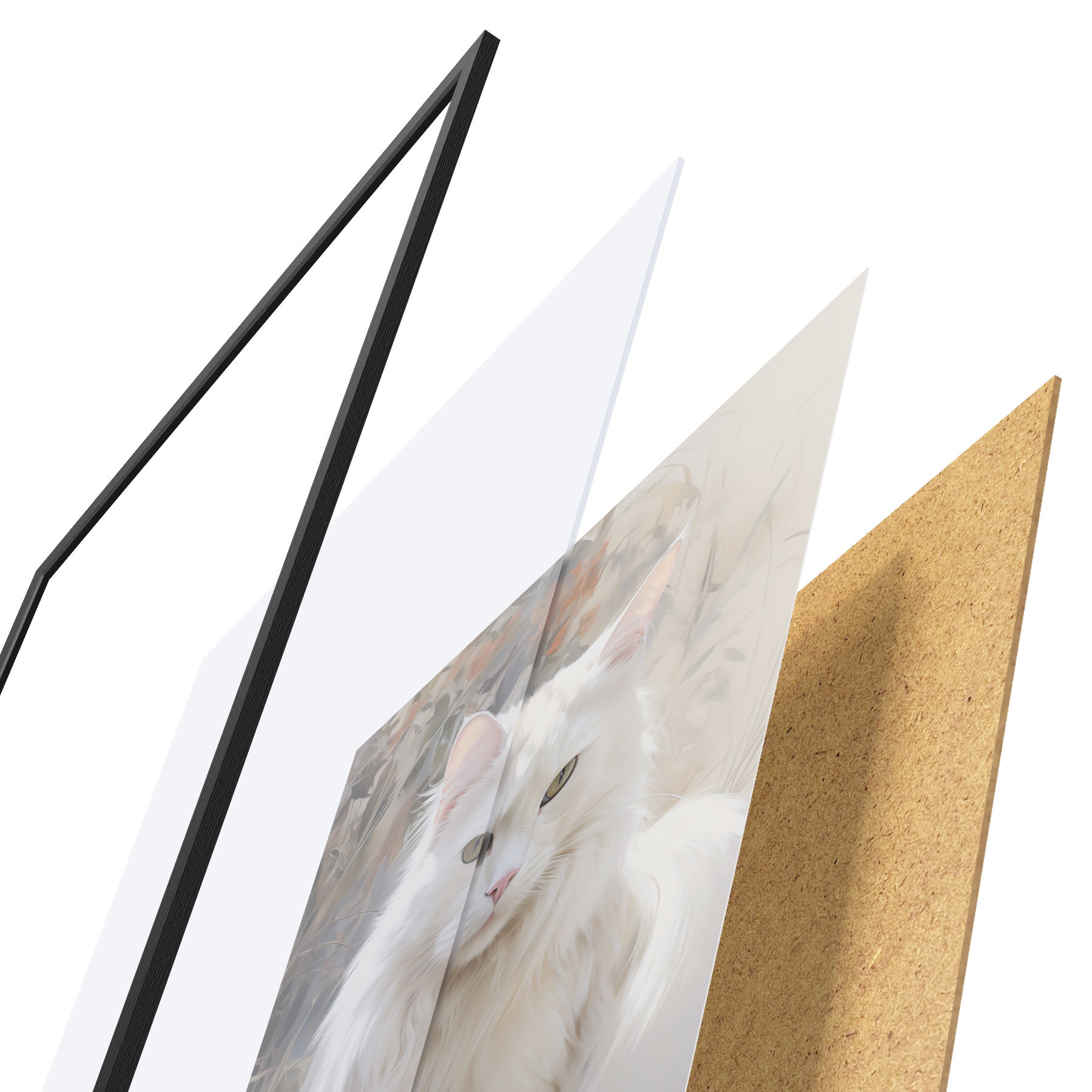 De poster bestaat uit een frame, plexiglas, geprinte afbeelding en spaanplaat achterkant. De poster kan meteen aan de muur worden gehangen dankzij de bevestigingen op de achterkant.