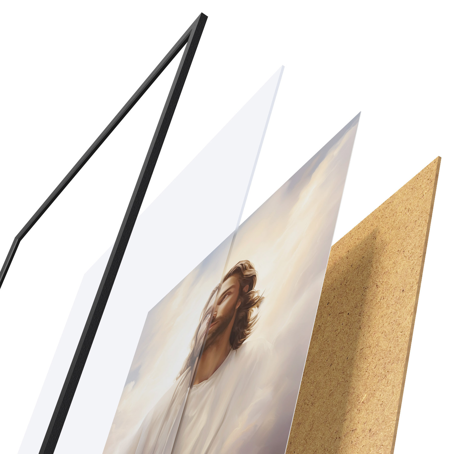 De poster bestaat uit een frame, plexiglas, geprinte afbeelding en spaanplaat achterkant. De poster kan meteen aan de muur worden gehangen dankzij de bevestigingen op de achterkant.