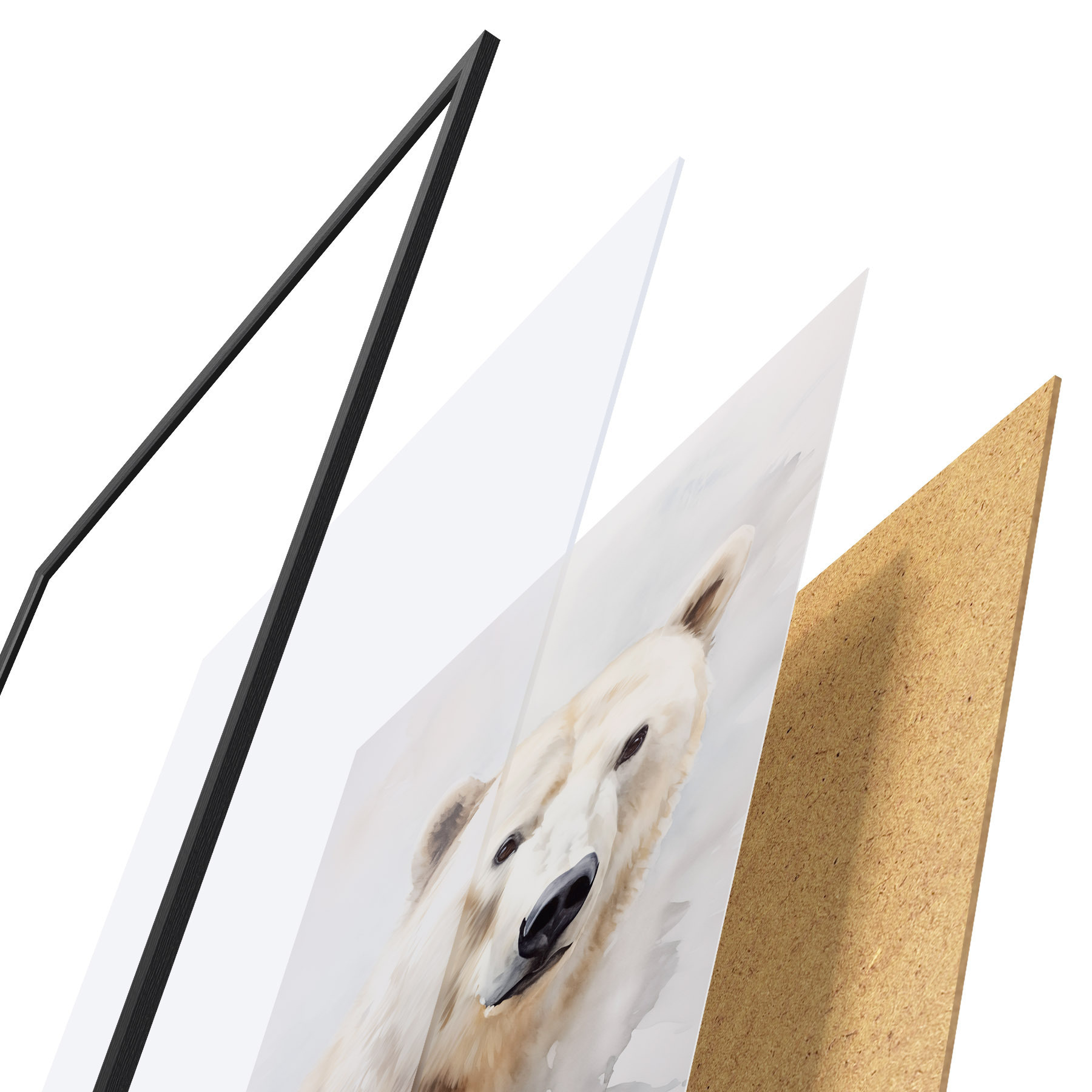 De poster bestaat uit een frame, plexiglas, geprinte afbeelding en spaanplaat achterkant. De poster kan meteen aan de muur worden gehangen dankzij de bevestigingen op de achterkant.