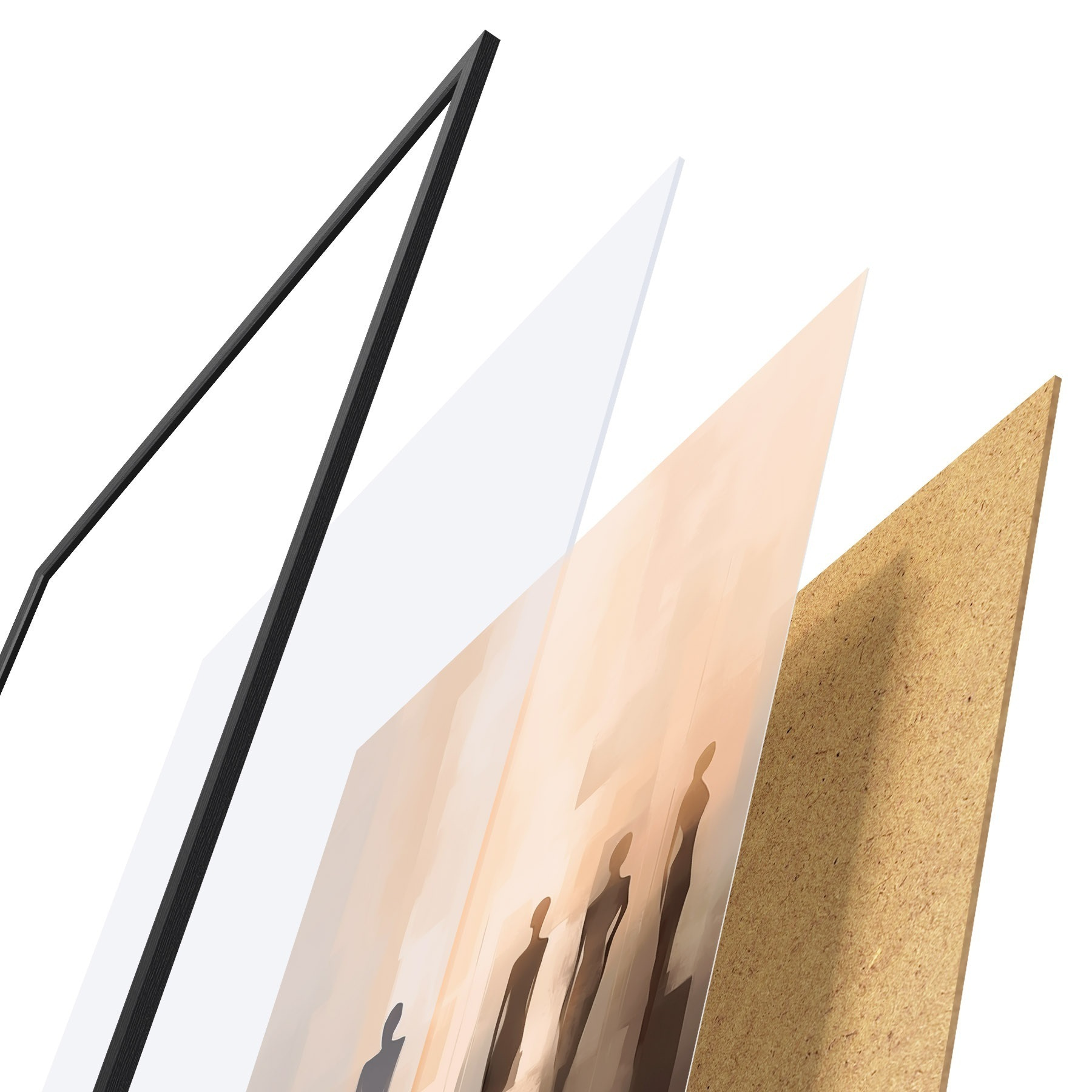 De poster bestaat uit een frame, plexiglas, geprinte afbeelding en spaanplaat achterkant. De poster kan meteen aan de muur worden gehangen dankzij de bevestigingen op de achterkant.