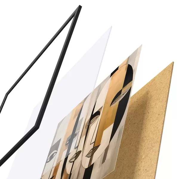 De poster bestaat uit een frame, plexiglas, geprinte afbeelding en spaanplaat achterkant. De poster kan meteen aan de muur worden gehangen dankzij de bevestigingen op de achterkant.