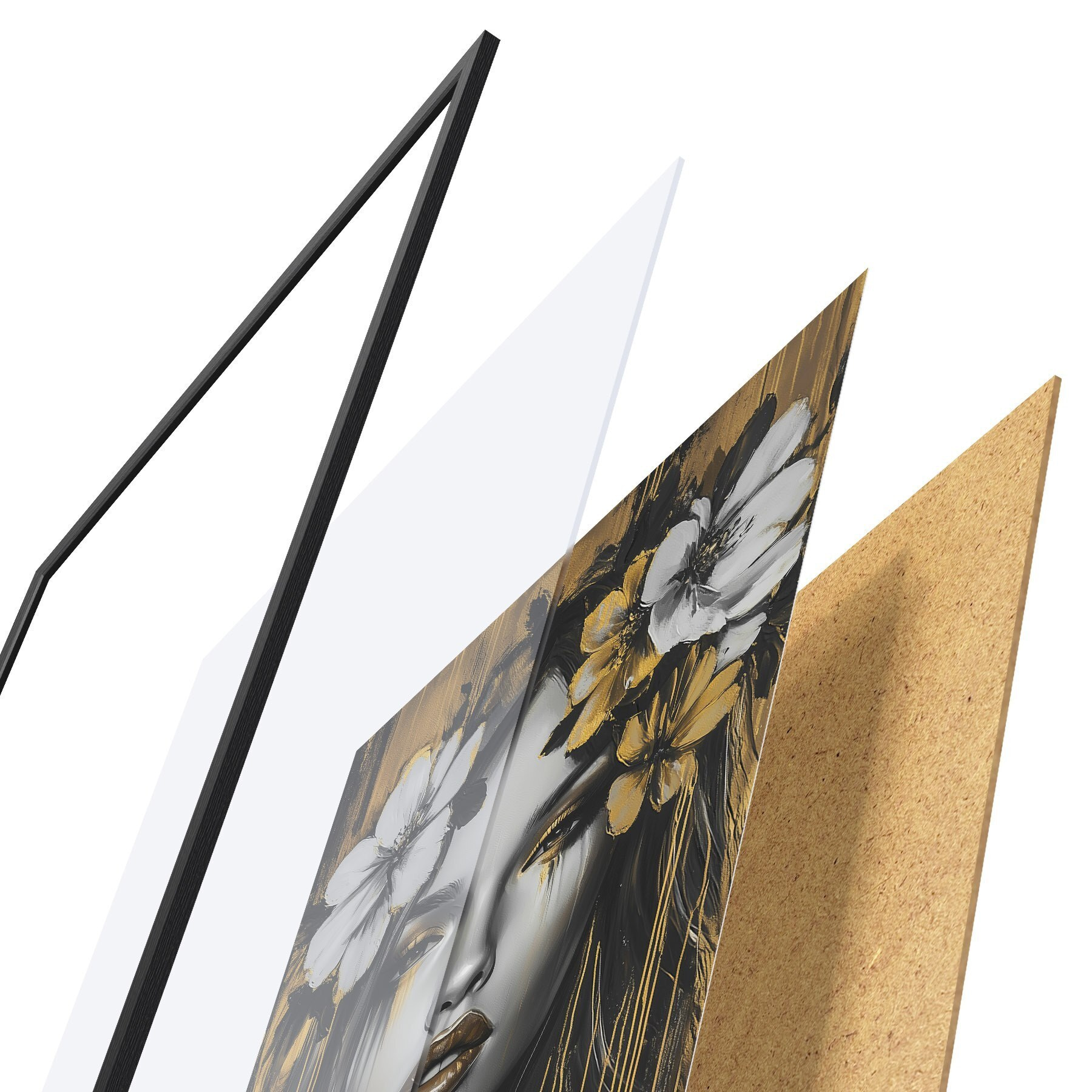 De poster bestaat uit een frame, plexiglas, geprinte afbeelding en spaanplaat achterkant. De poster kan meteen aan de muur worden gehangen dankzij de bevestigingen op de achterkant.