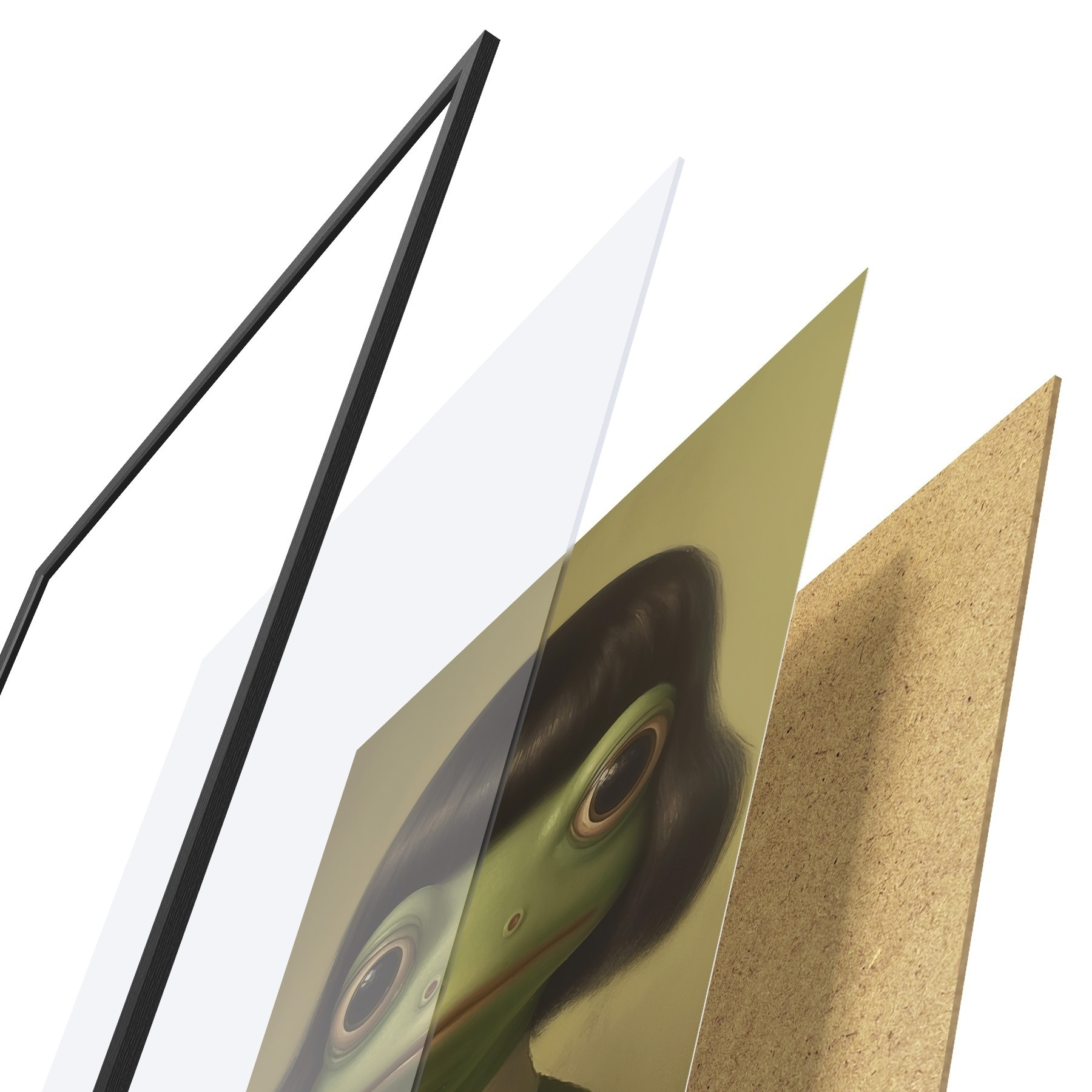 De poster bestaat uit een frame, plexiglas, geprinte afbeelding en spaanplaat achterkant. De poster kan meteen aan de muur worden gehangen dankzij de bevestigingen op de achterkant.