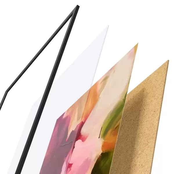 De poster bestaat uit een frame, plexiglas, geprinte afbeelding en spaanplaat achterkant. De poster kan meteen aan de muur worden gehangen dankzij de bevestigingen op de achterkant.