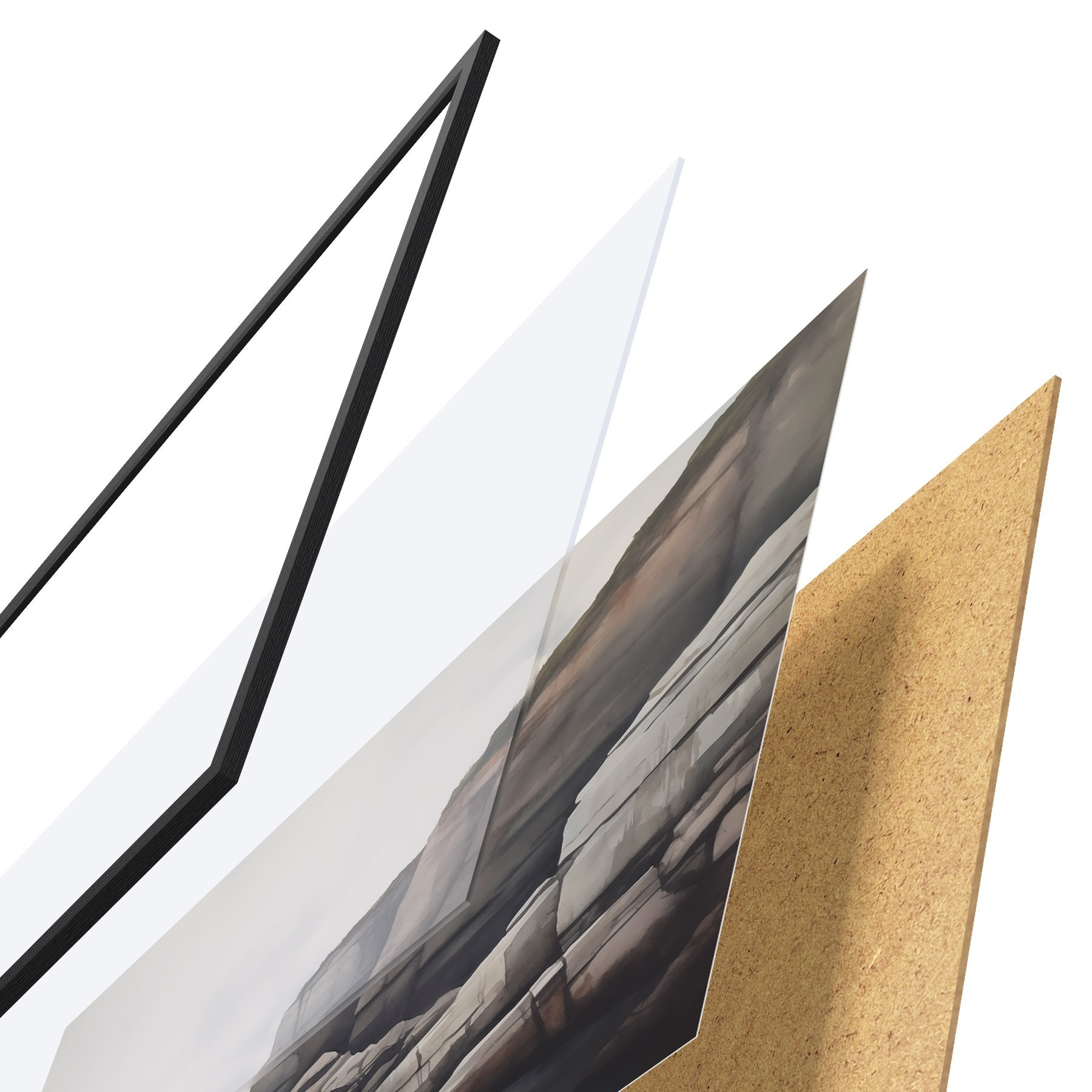 De poster bestaat uit een frame, plexiglas, geprinte afbeelding en spaanplaat achterkant. De poster kan meteen aan de muur worden gehangen dankzij de bevestigingen op de achterkant.