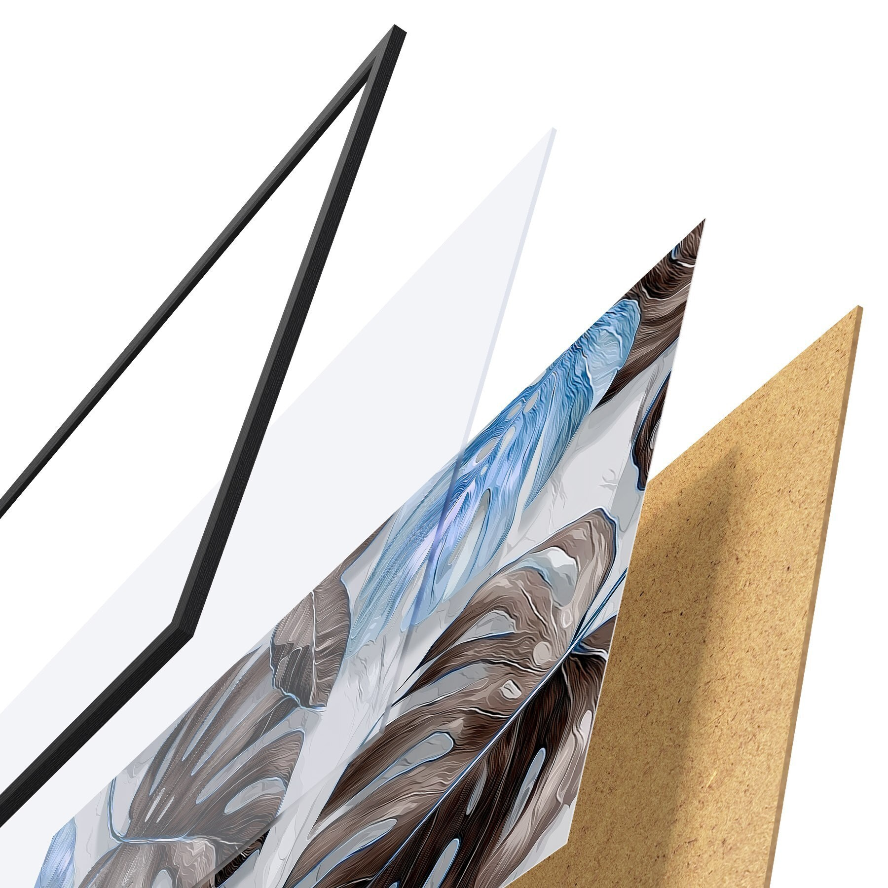 De poster bestaat uit een frame, plexiglas, geprinte afbeelding en spaanplaat achterkant. De poster kan meteen aan de muur worden gehangen dankzij de bevestigingen op de achterkant.