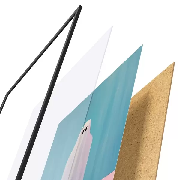 De poster bestaat uit een frame, plexiglas, geprinte afbeelding en spaanplaat achterkant. De poster kan meteen aan de muur worden gehangen dankzij de bevestigingen op de achterkant.