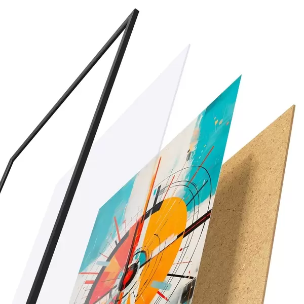 De poster bestaat uit een frame, plexiglas, geprinte afbeelding en spaanplaat achterkant. De poster kan meteen aan de muur worden gehangen dankzij de bevestigingen op de achterkant.