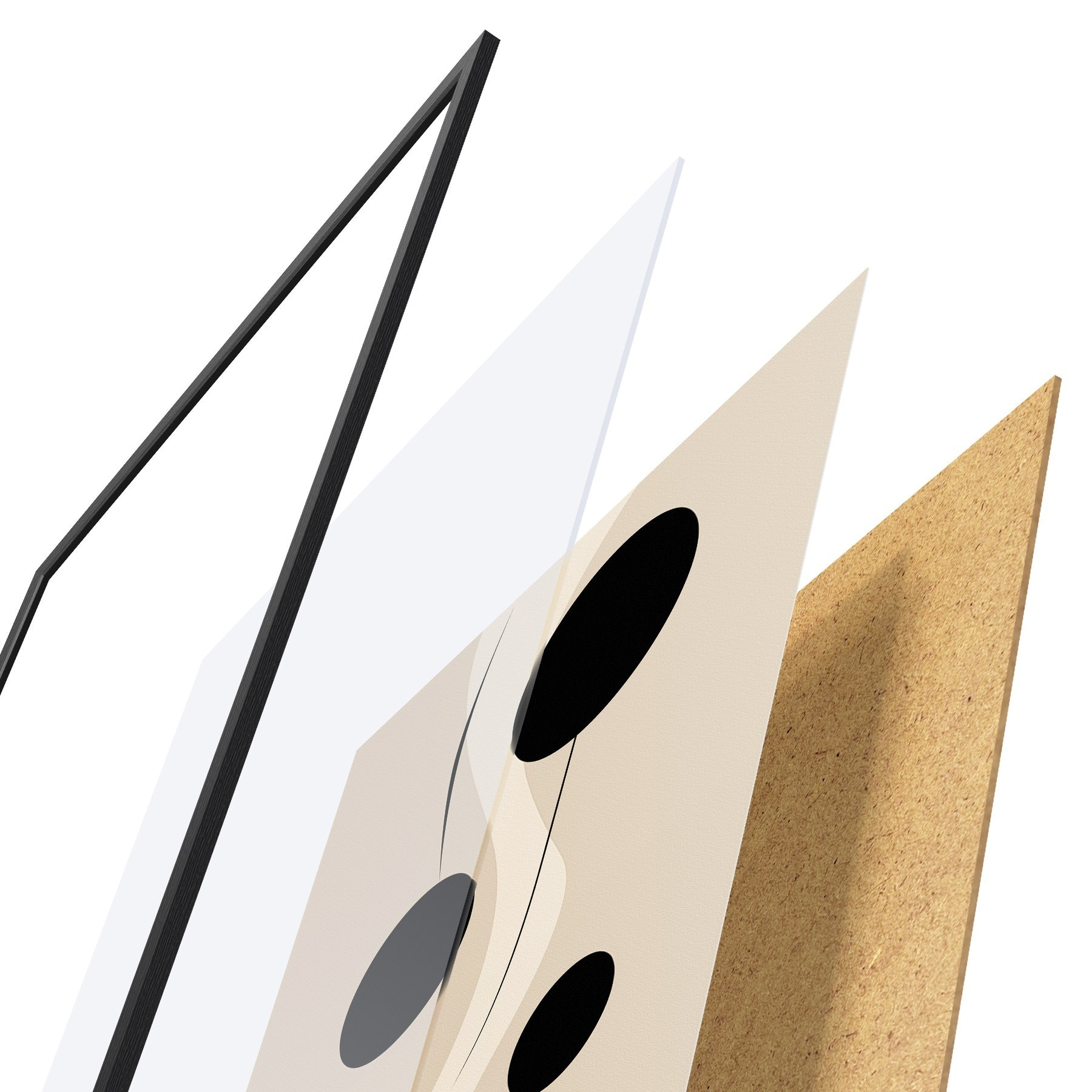 De poster bestaat uit een frame, plexiglas, geprinte afbeelding en spaanplaat achterkant. De poster kan meteen aan de muur worden gehangen dankzij de bevestigingen op de achterkant.